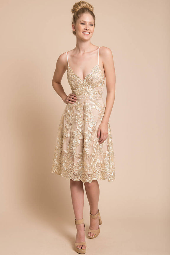 24 Karat love! This gorgeous gown radiates with stunning lace details. Pair with gold heel sandals and step into the limelight.