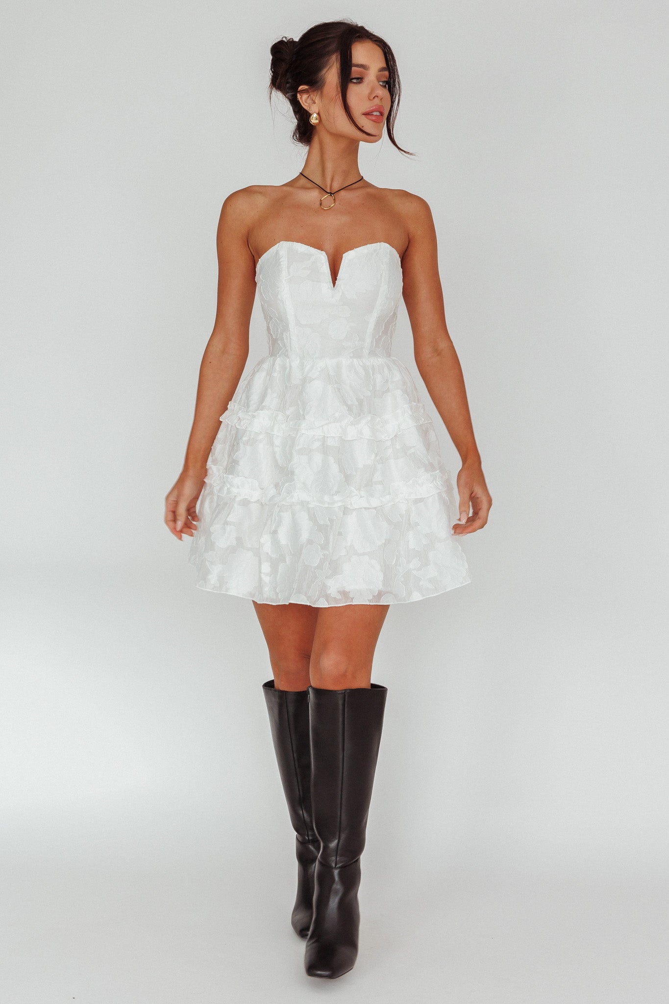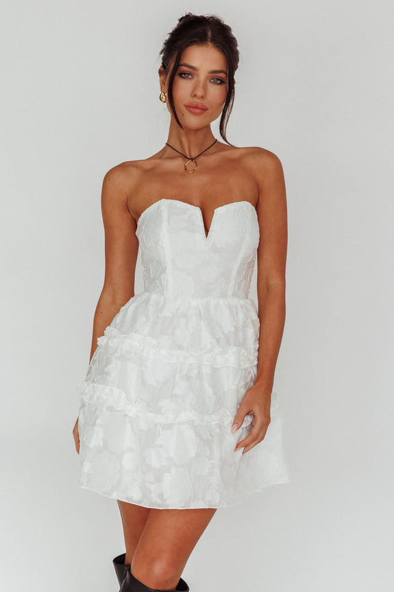 Make an entrance in our pretty Demi mini dress. We are in love with its frill trim detail and strapless style. Perfect for a bachelorette or birthday party. Team it with strappy, white heels and a clutch for a look we are loving.