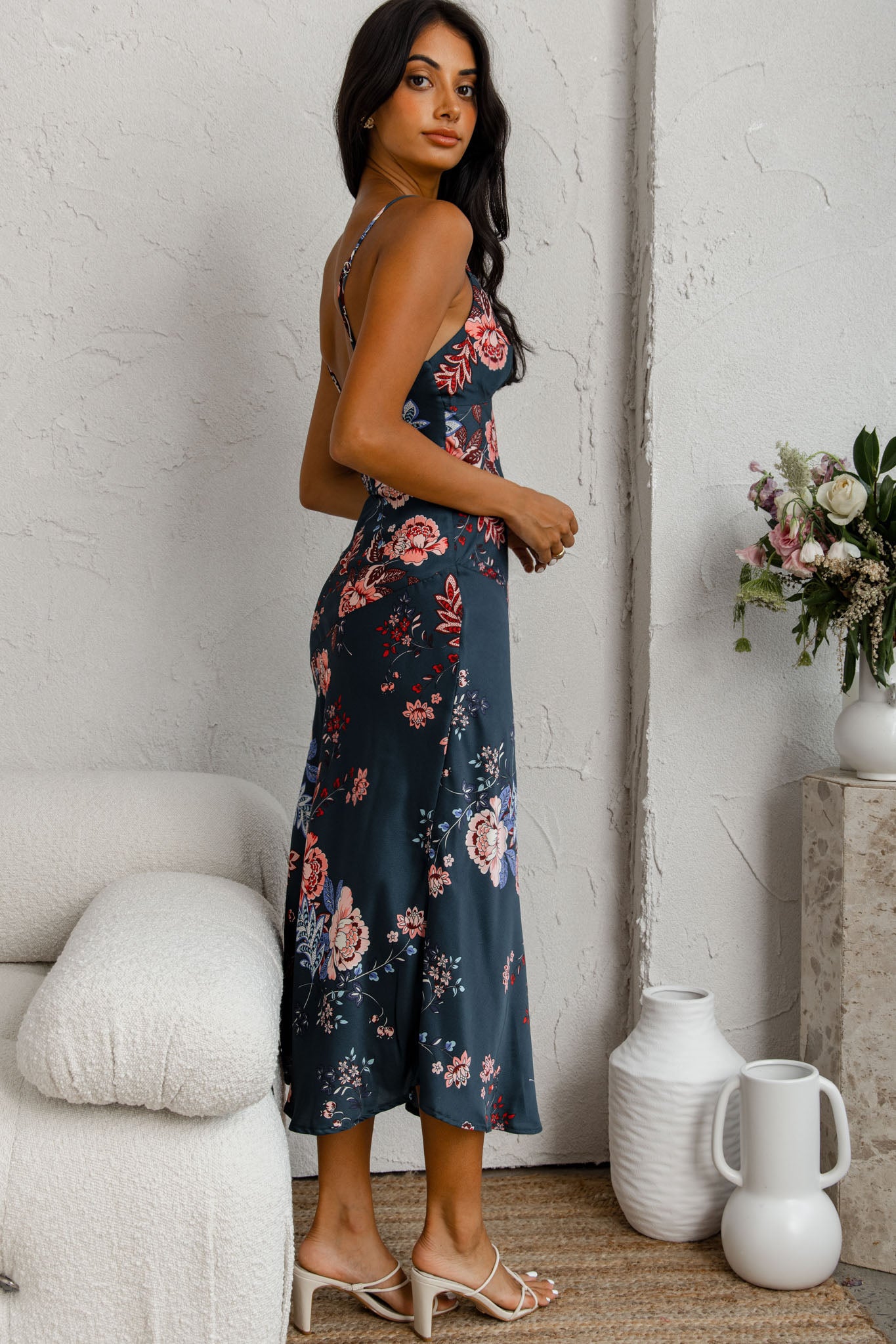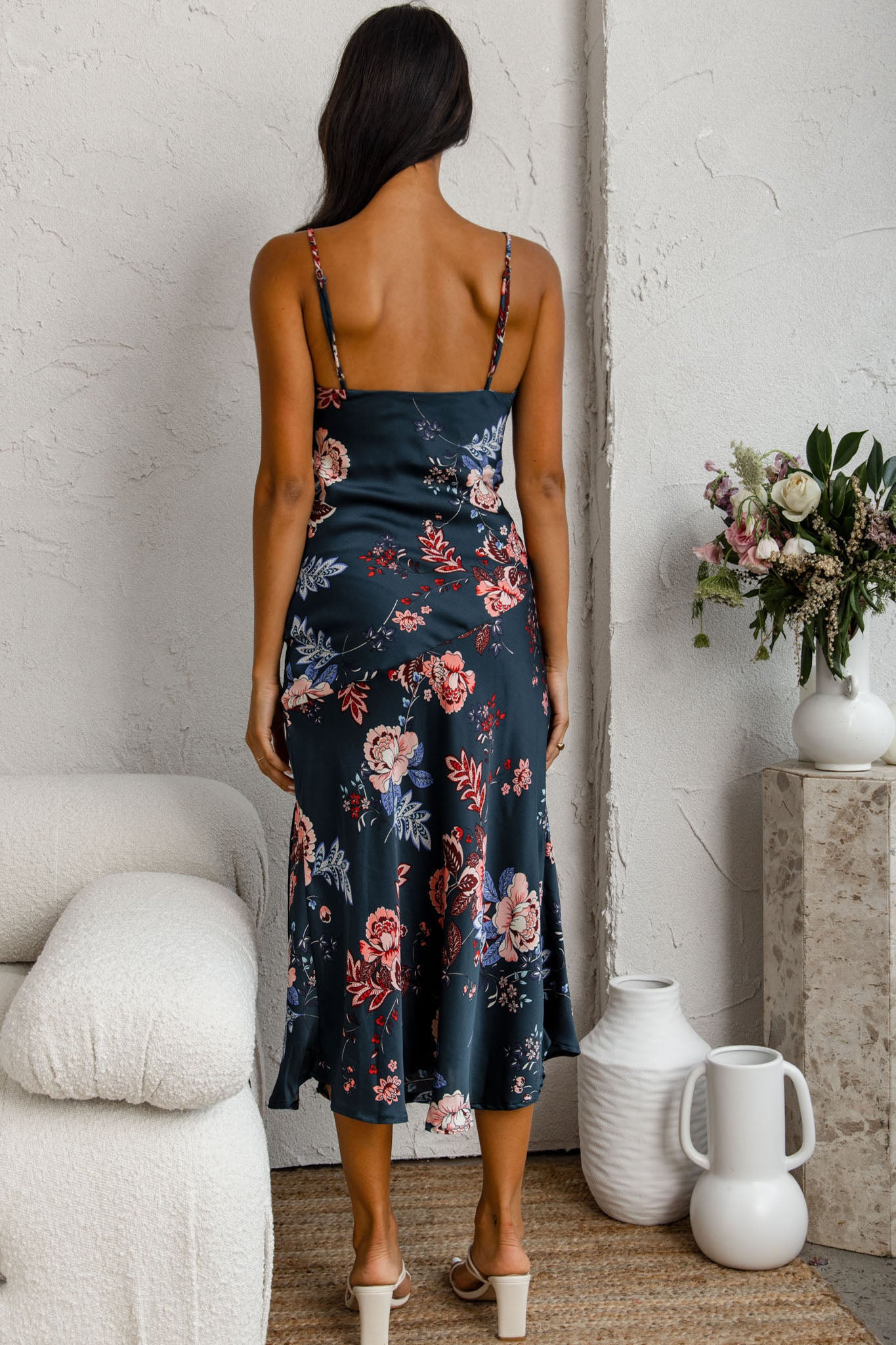 Downtown Cami Strap Front Split Midi Dress Oriental Flower Print Forest Green