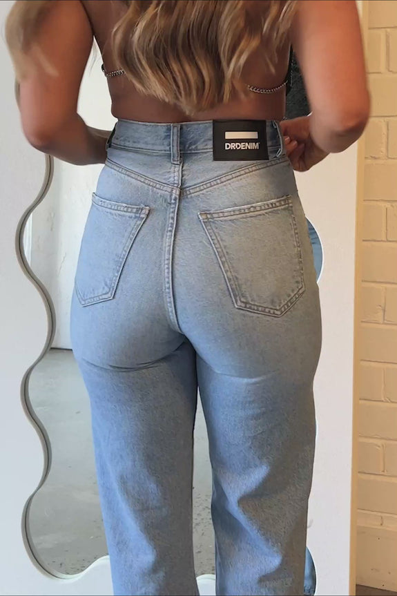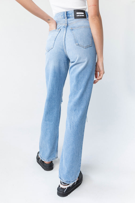 The Echo Straight Leg Jean in Empress Sky Blue Rip is our vintage fit jean that puts emphasis on the waist. With a sky high rise and a straight leg, this style offers a flattering fit and rests perfectly on the shoe. Made from a rigid cotton, Echo has a truly authentic retro look.