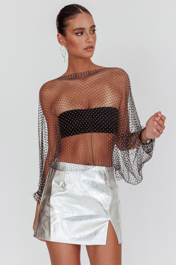 Okay, girl! We see you! You will light up every room in our sparkly Drama, Drama top. It features a gorgeous diamante fishnet throughout and long, puffy sleeves. Wear it to your next music festival teamed with a mini skirt and boots for a super hot look that will turn heads.