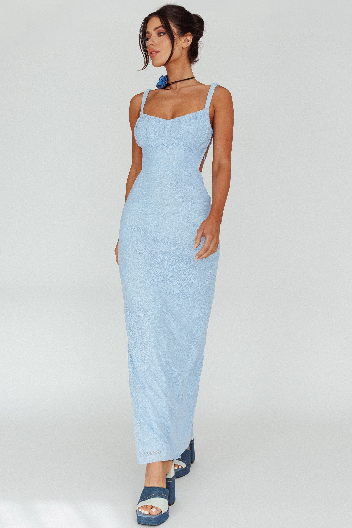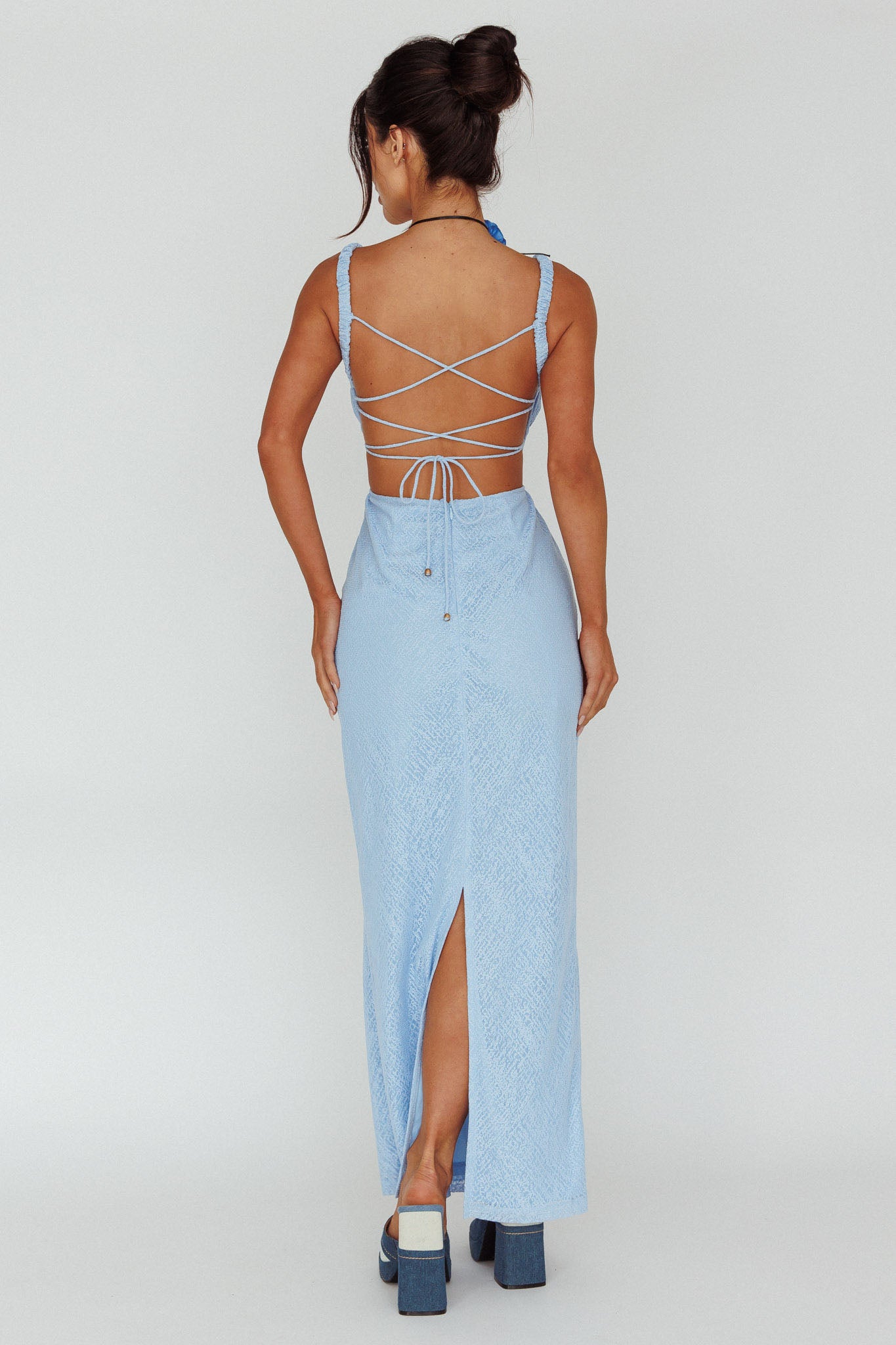 Dream Crush Lace-Up Back Mesh Overlay Midi Dress Blue