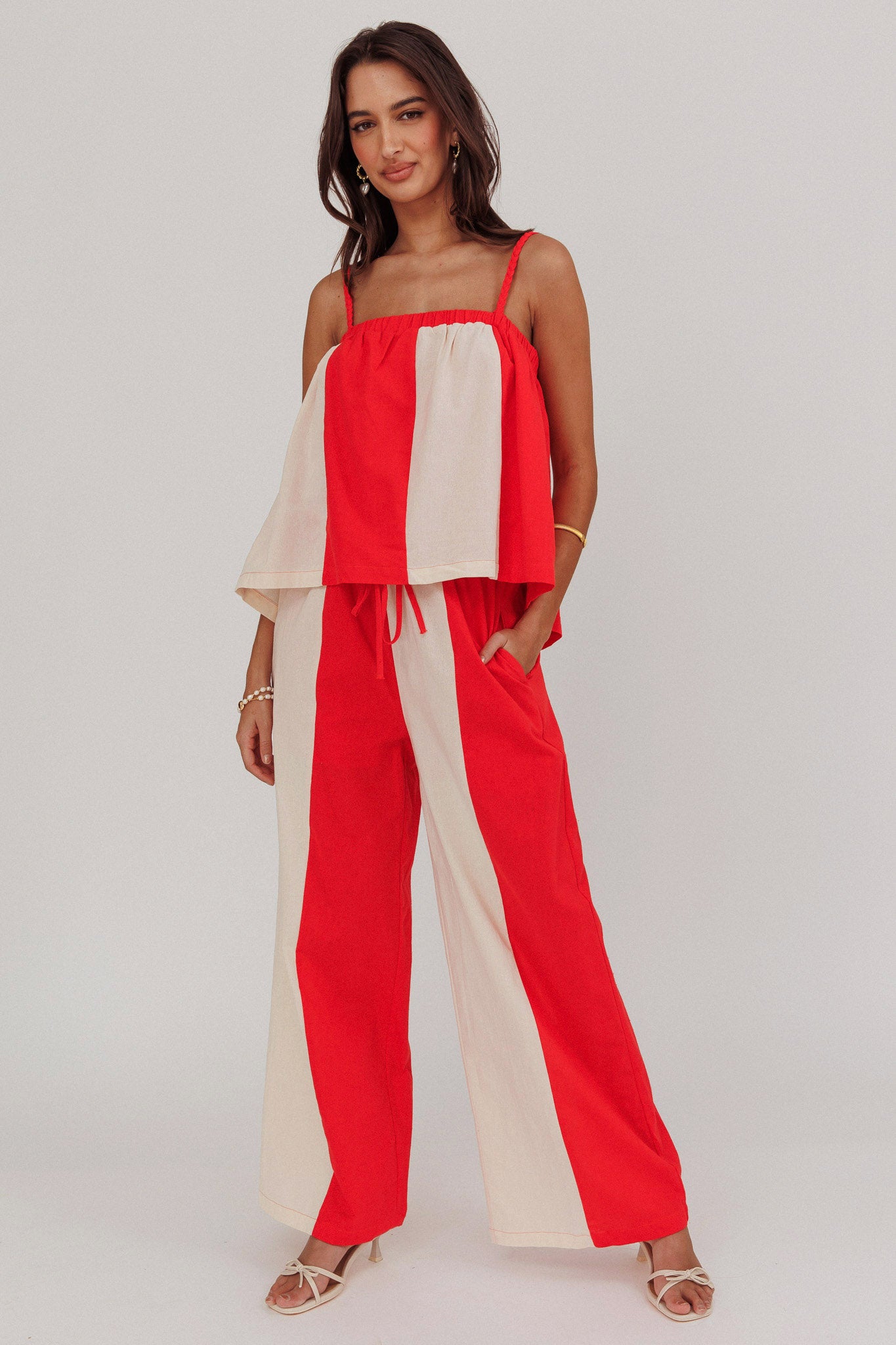 Introducing our chic Dream Girl top. Featuring braided straps that add a touch of texture, this piece is designed to elevate your wardrobe effortlessly. The contrast paneling creates a striking visual impact, perfect for those who like to make a statement. Pair it with it's matching pant or mix and match for endless possibilities!