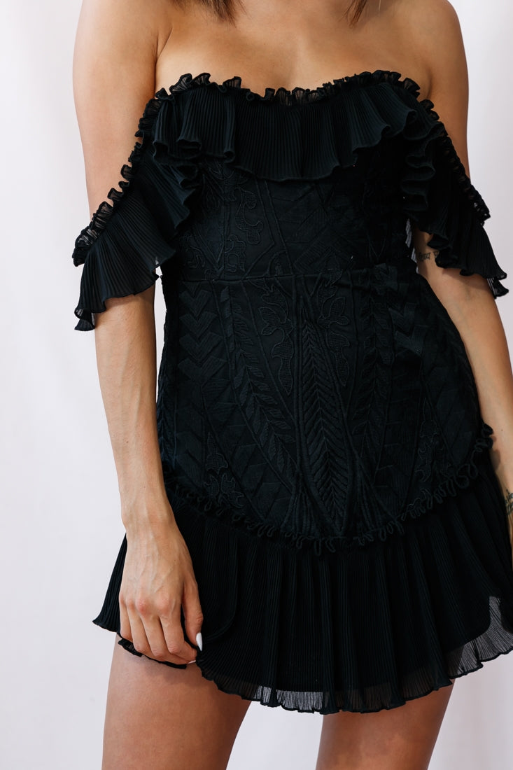 Stop whatever you are doing and take a moment to behold the beauty that is our Dreamy dress. Aptly named because, well, it's just downright DREAMY. The slight sweetheart neckline, the drapey off-shoulder, crape ruffle sleeves, the flirty ruffle hemline, this dress has it all! And how stunning is that embroidery throughout the torso? Heaven! Pair it with simple nude heels because this dress is already perfection.