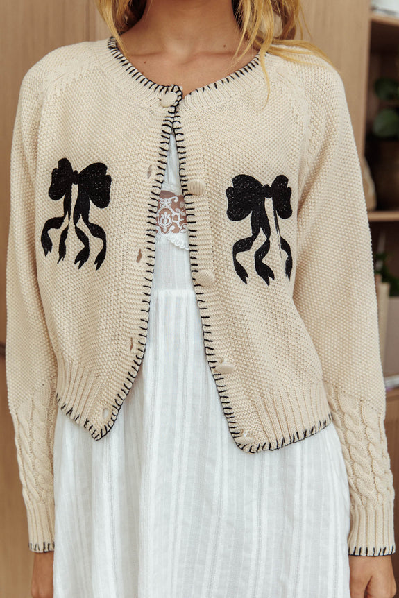 You will be flooded with compliments in our adorable Early Snow cardigan. We are in love with its blanket stitch detail and girly bow motifs. It's giving cozy coquette and we are here for it! Team it with a denim mini and knee-high boots for an on-trend look.