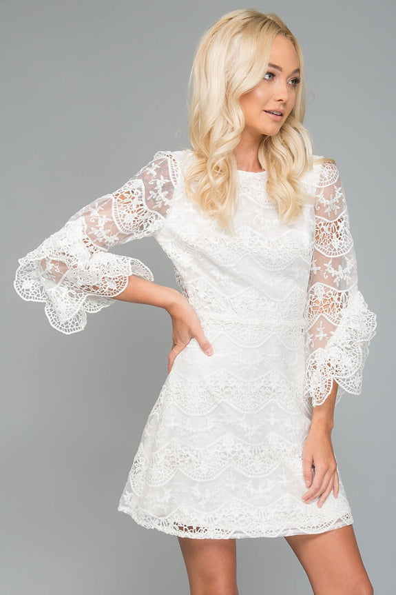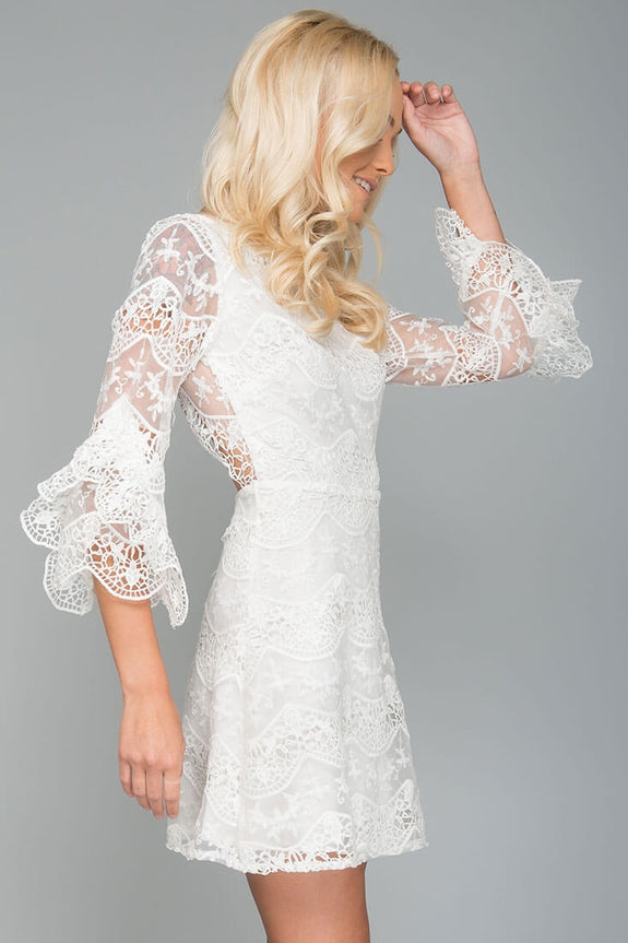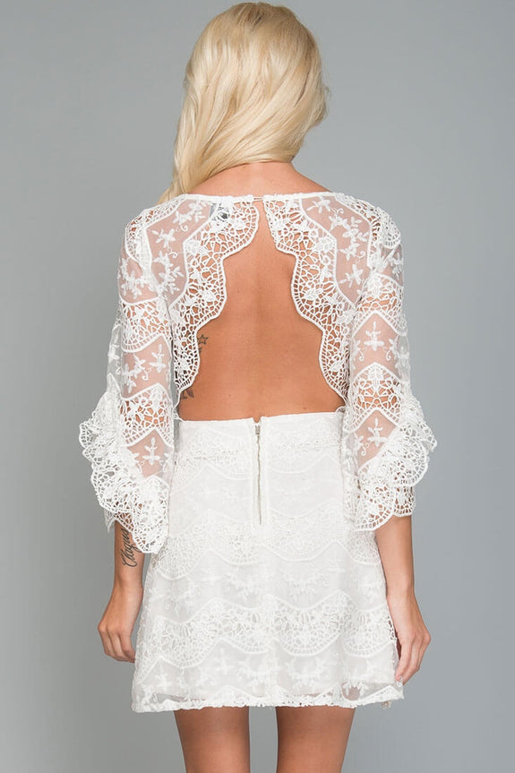 Sweet enough to marry, this romantic dress is both modest and magical. Ruffled bell sleeves and lace overlay keep this feminine and fun while the open back grants a bit of sex appeal. Wear with fun, strappy heels.