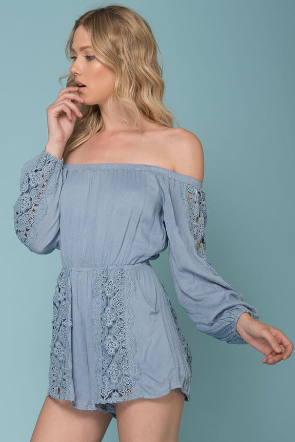 Eliana Off The Shoulder Lace Sleeve Romper Blue