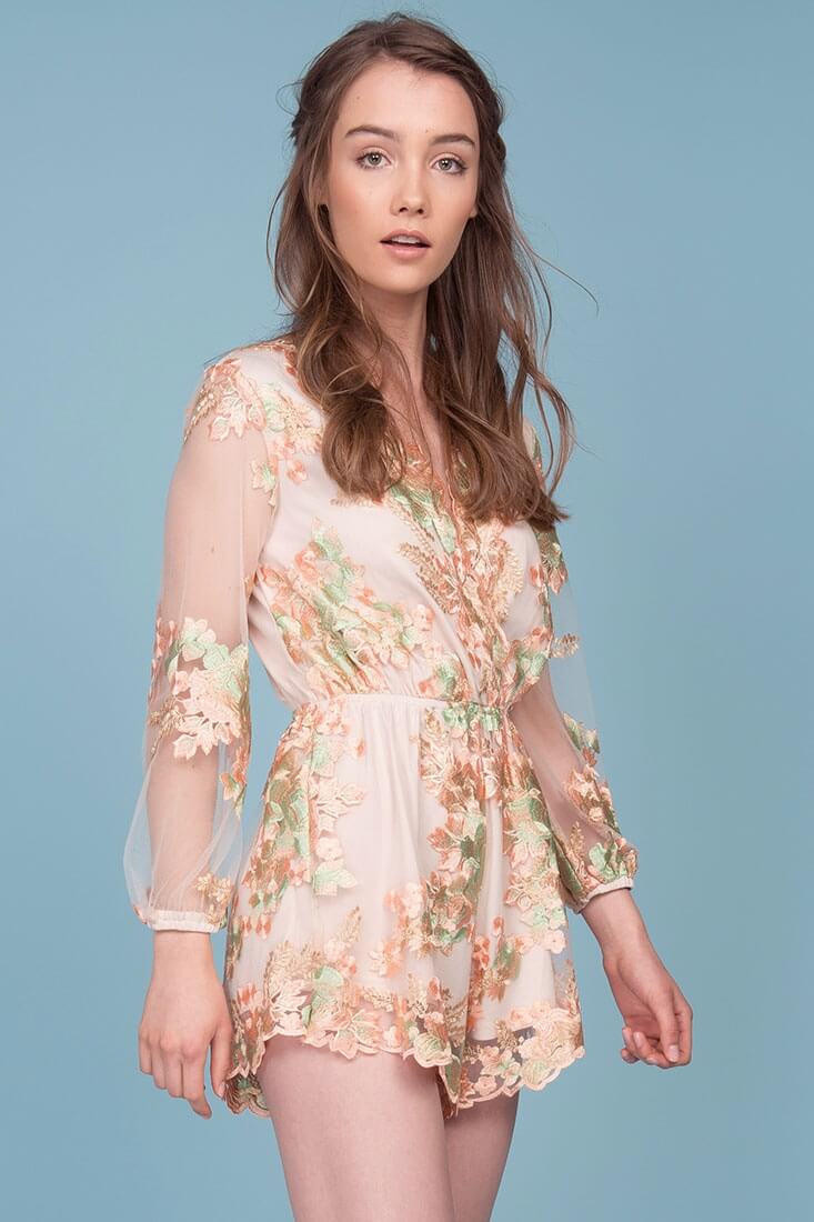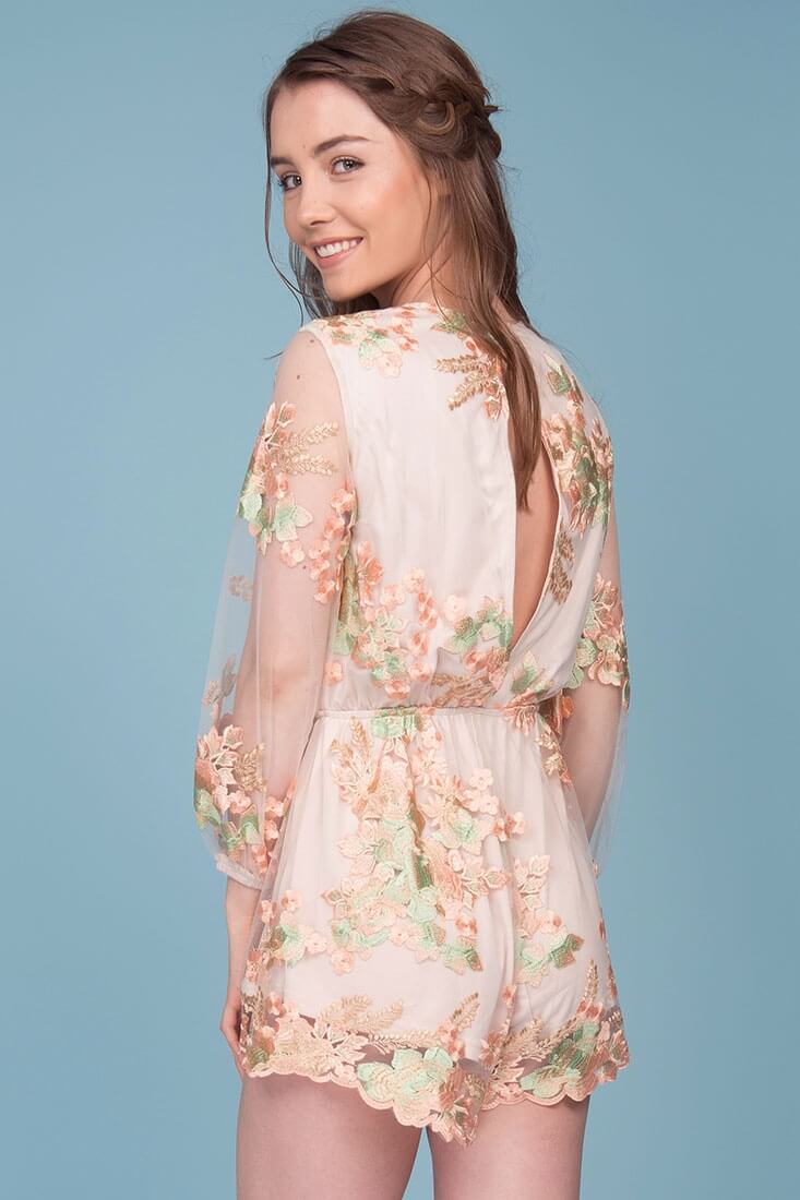 Victorian flair is reborn in the Emelia Embroidered Floral Romper. Wear with a chunky, open-toed kitten heel.