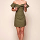 Figure hugging and elegant off the shoulder dress finished with a tie across the chest.