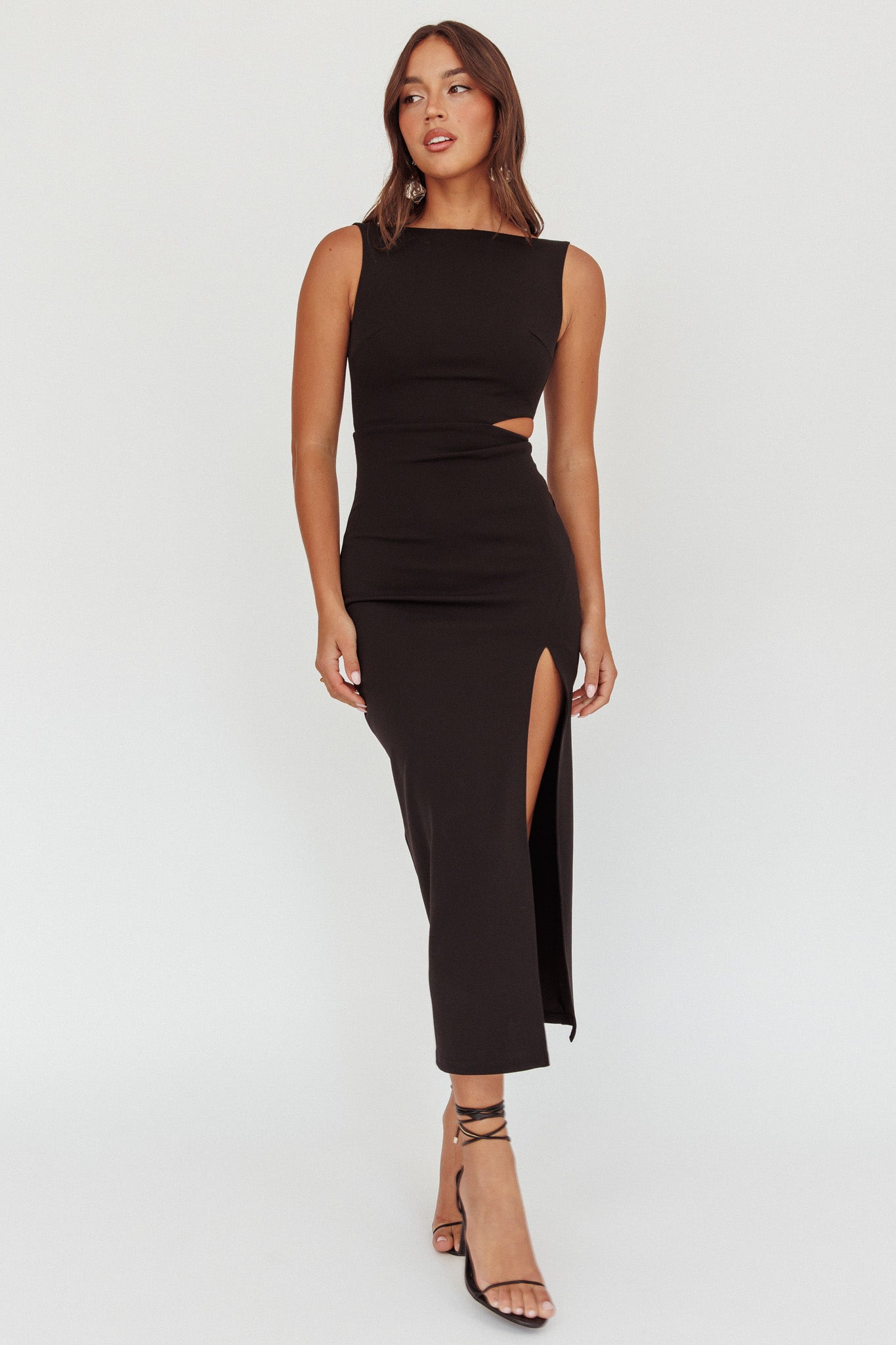 Make them stop and stare in our elegant Emille midi dress. It features a cut-out waist and thigh-high split. It's perfect for a wedding or special event! Team it with strappy heels and a purse for a gorgeous look.