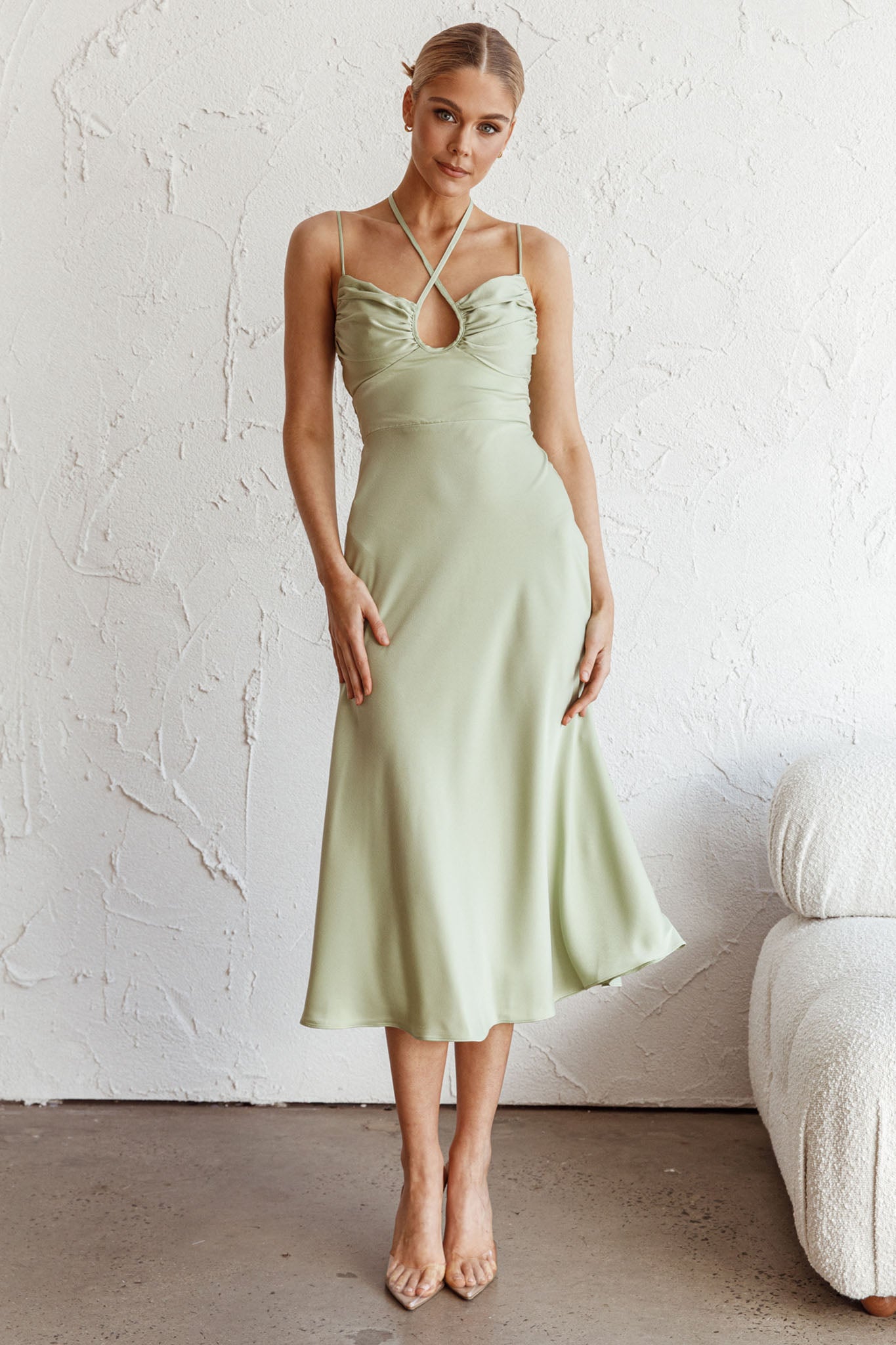 - Sage, satin midi dress