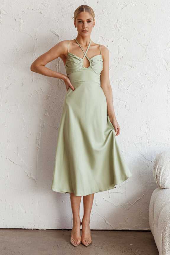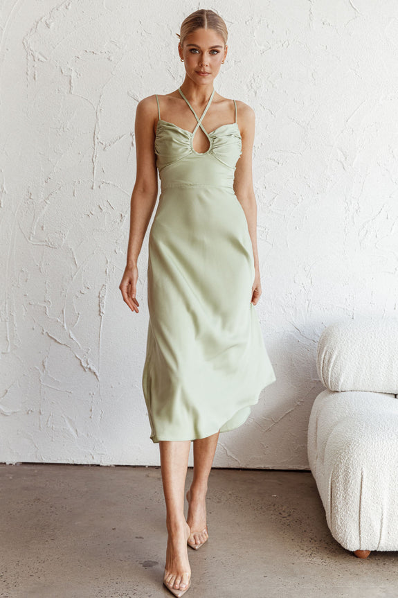 Turn heads in our gorgeous Emmalie midi dress. Featuring a string-tie halterneck and satin fabric, it's perfect for a wedding or special occasion. Team it with diamante mules and a tote for an elegant look.