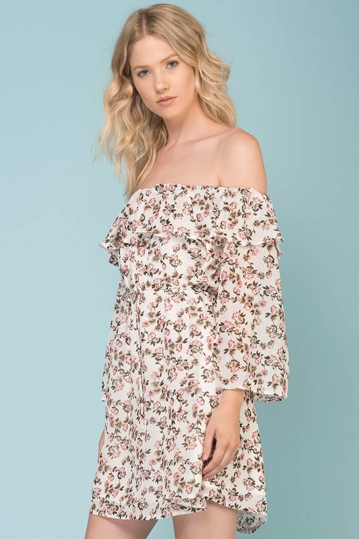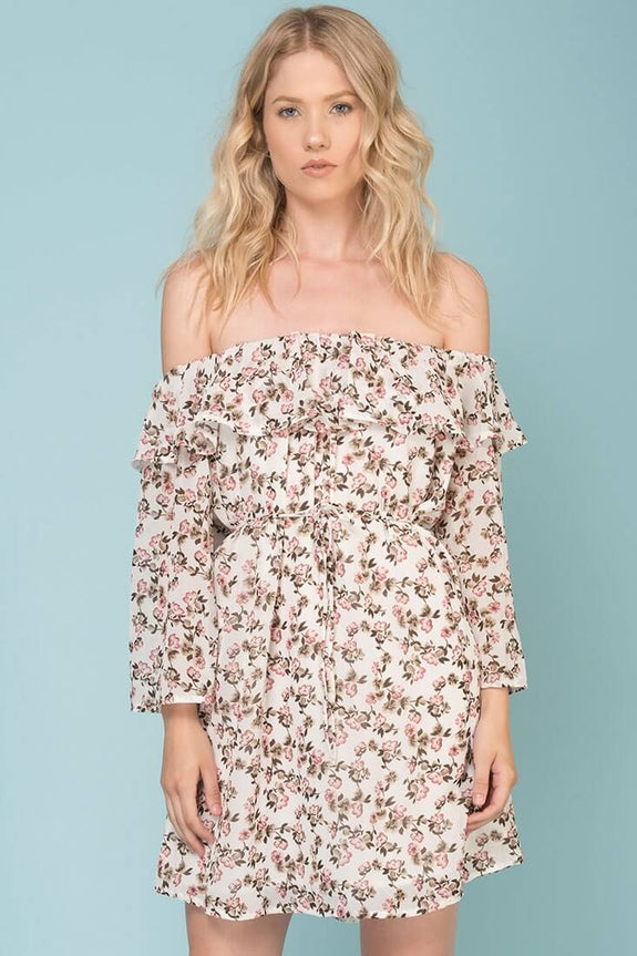 Off the shoulder ruffled detail balance the flowy sleeves and subtle waist tie. Wear with white sandals.