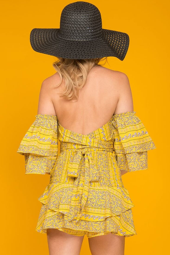 Ruffles everywhere! This set will look gorgeous anywhere! Off the shoulder bandeau top with exotic sleeves and wrap around skort look amazing on your next vacation or to brighten up your favorite bar. Pair with high brown-colored heels and statement earrings.