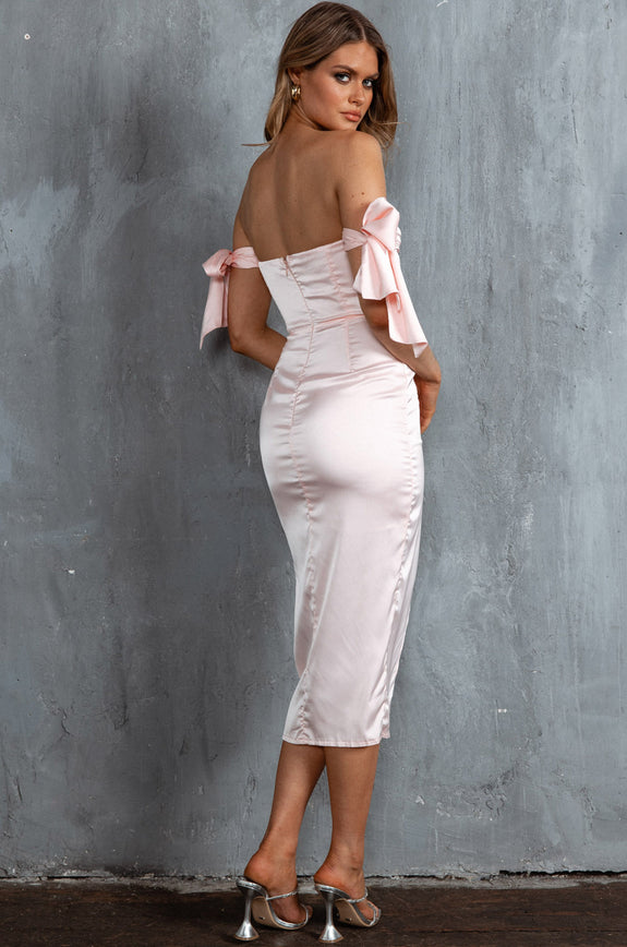 We are head over heels for our gorgeous Engelique midi dress. Featuring the prettiest, tied, off-shoulder sleeves and a split in the front. It's perfect for a wedding or special occasion teamed with diamante heels and a satin clutch.