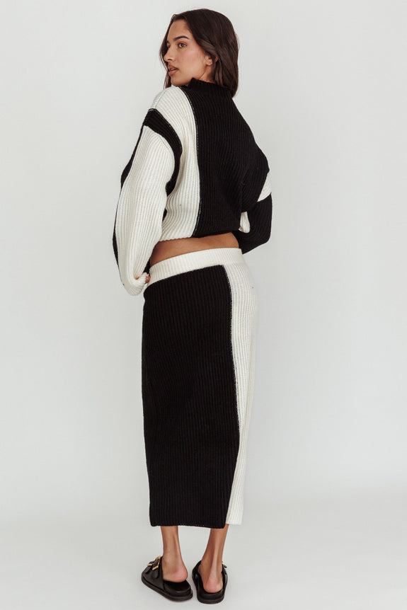 Effortlessly cool and stunningly beautiful, our Eos knit midi skirt is where cozy meets couture in perfect harmony. This skirt takes style to the next level with contrasting colors that create a captivating visual impact. Add a touch of sophistication to your outfit with your favorite jewelry and boots. Pair it with the matching jumper for an effortless and chic outfit.