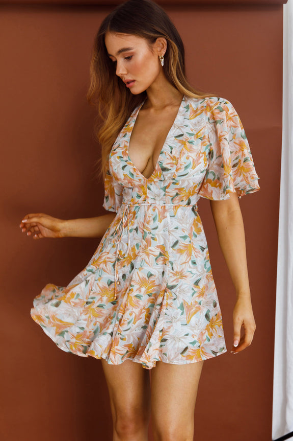 We a loving our chic Estelle dress. Featuring angel sleeves and a string tie around the waist. Perfect for brunching with your besties or happy hour teamed with your favorite mules and gold hoop earrings.