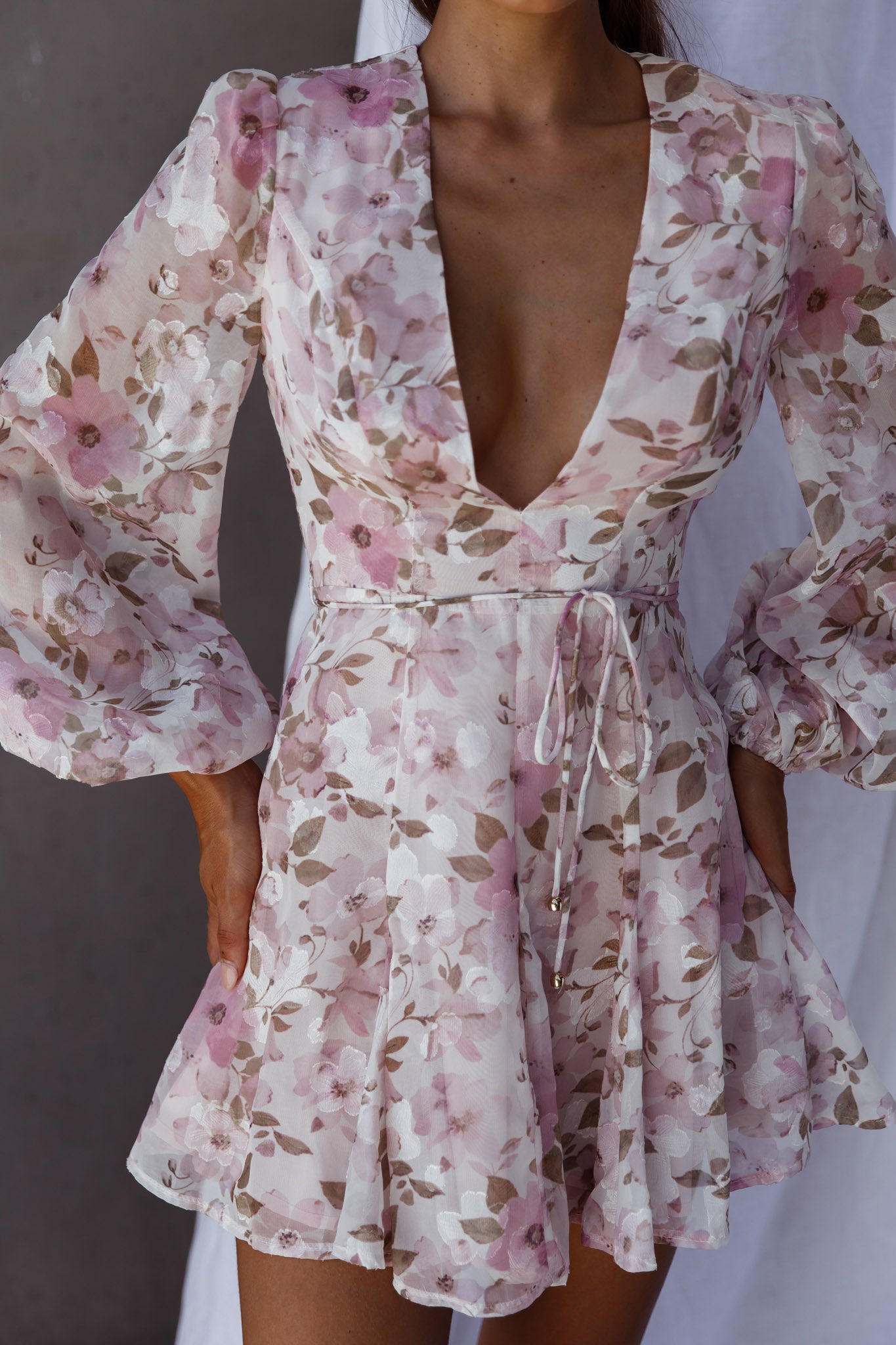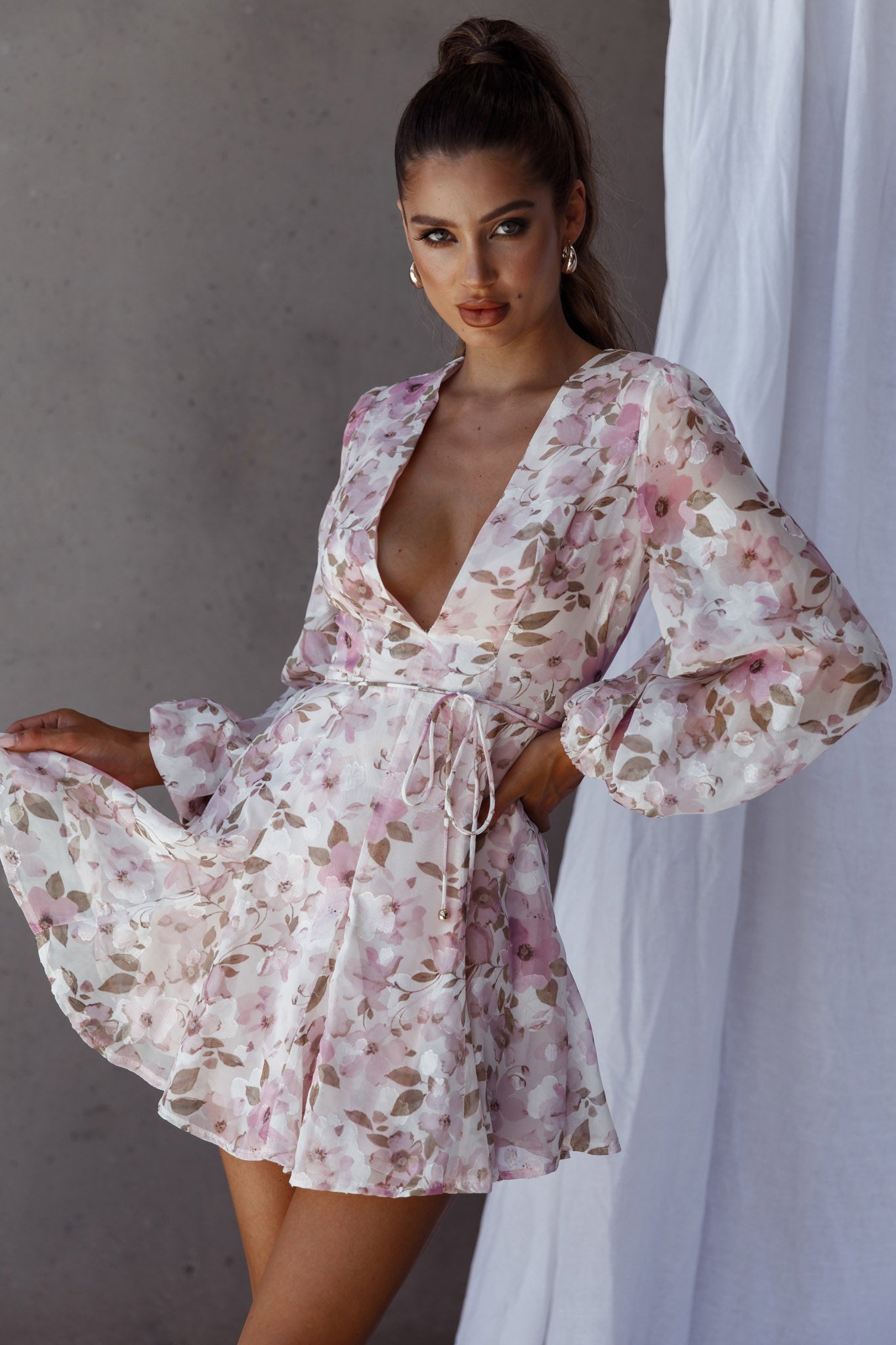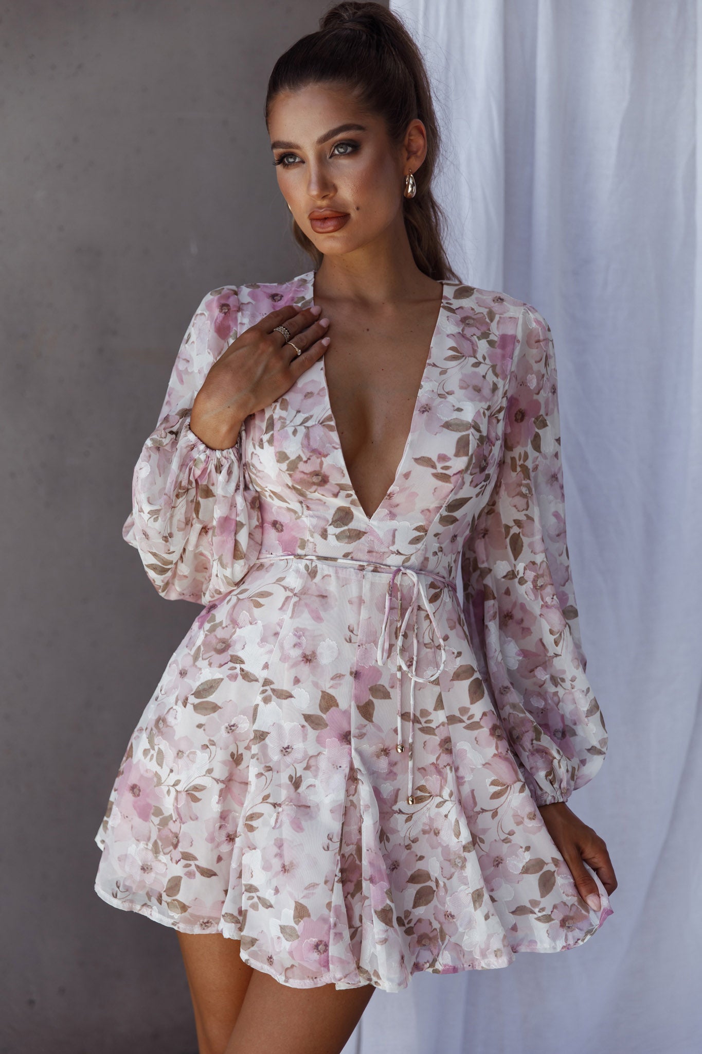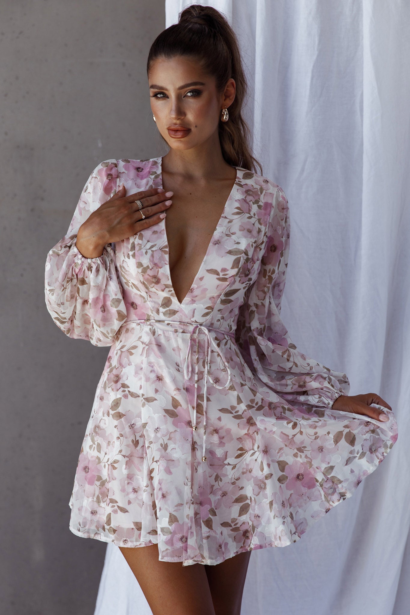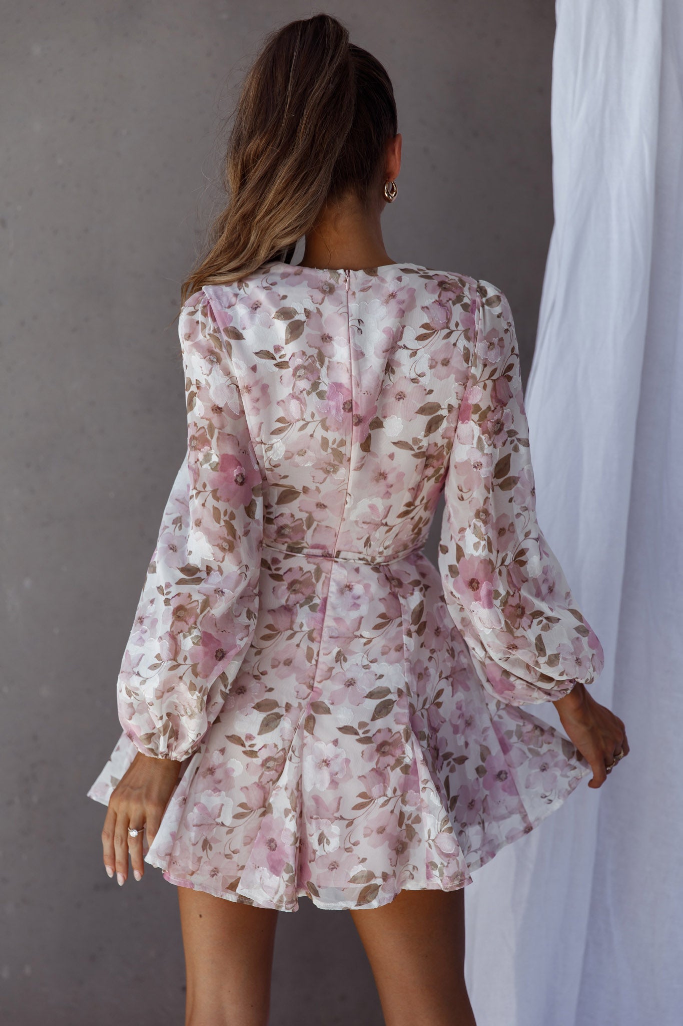 Estelle Long Sleeve V-Neckline Dress Watercolor Floral Print Rose
