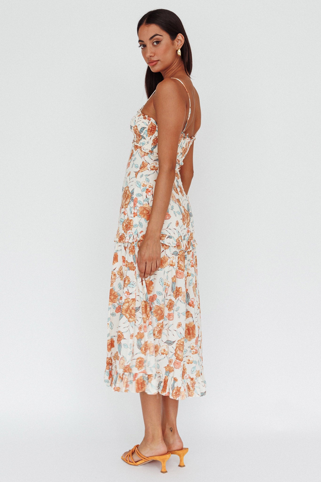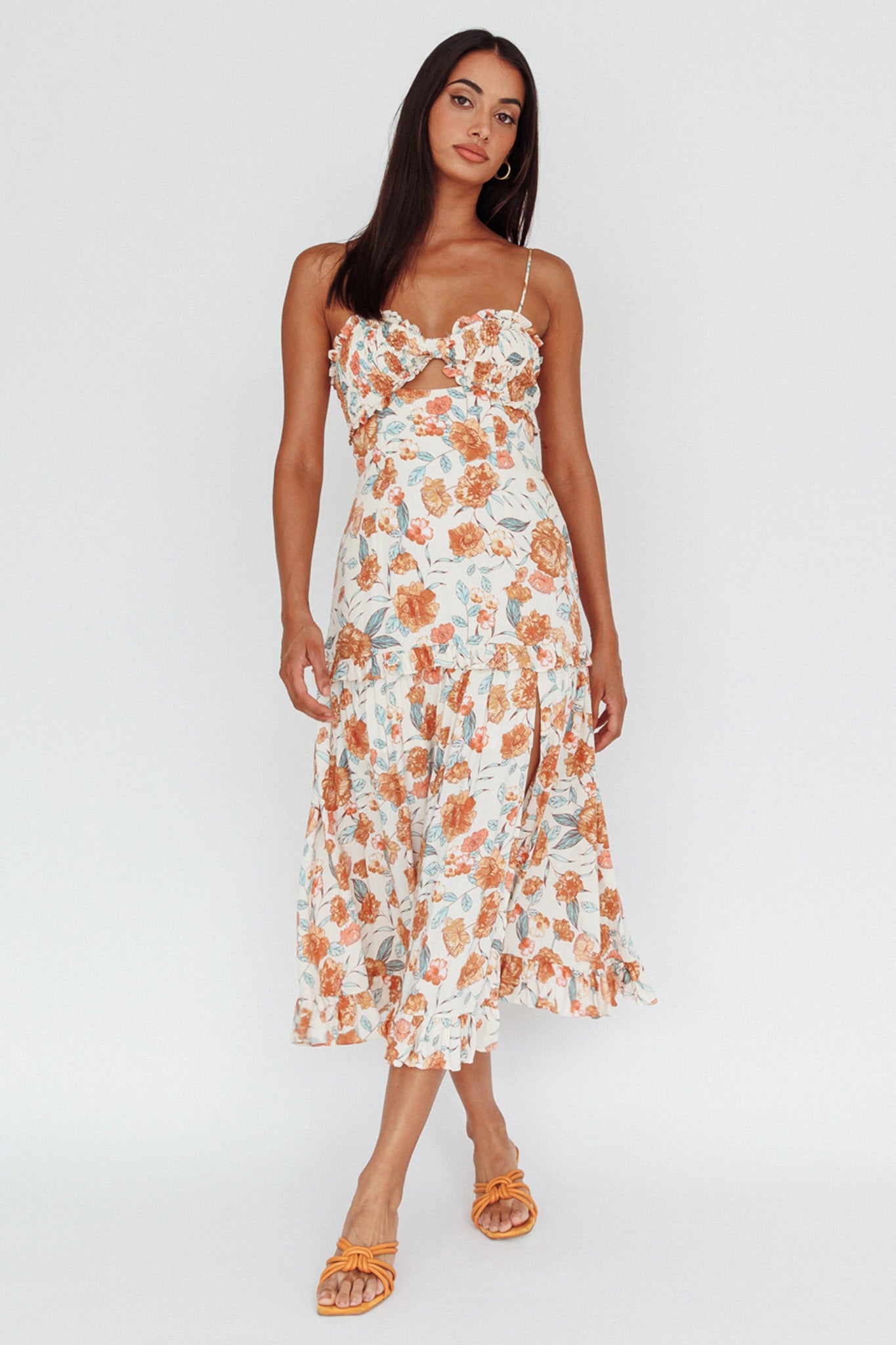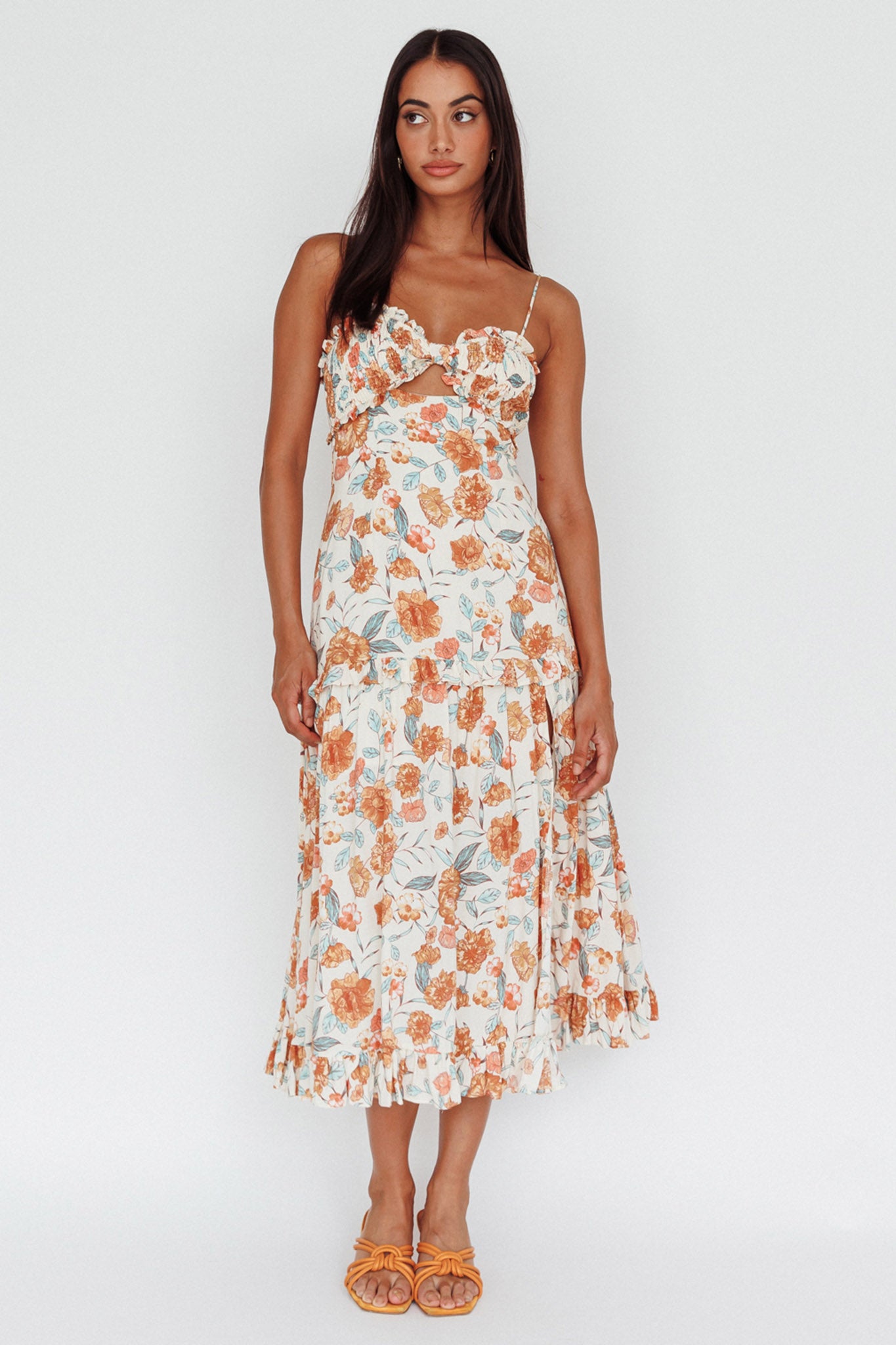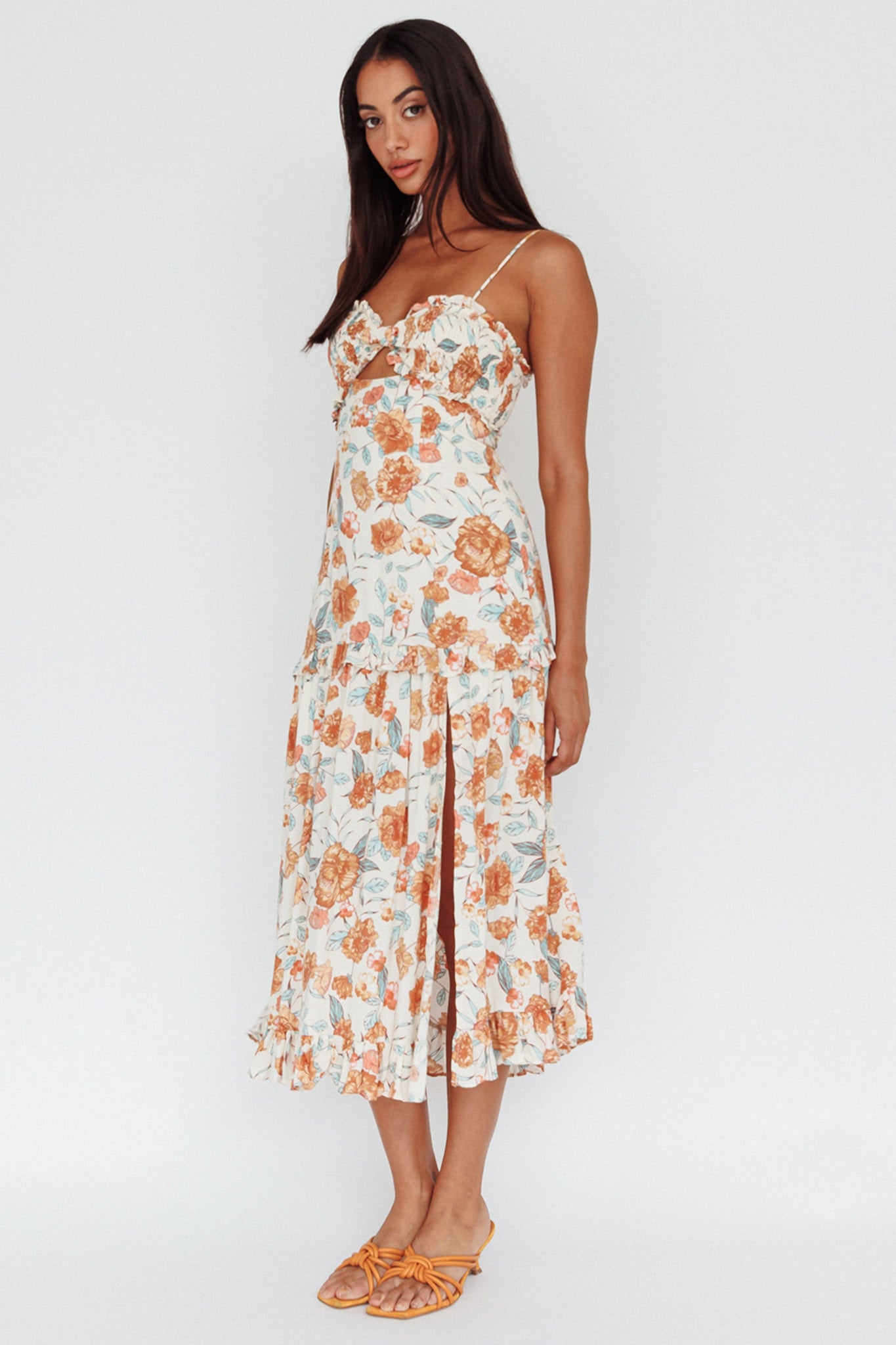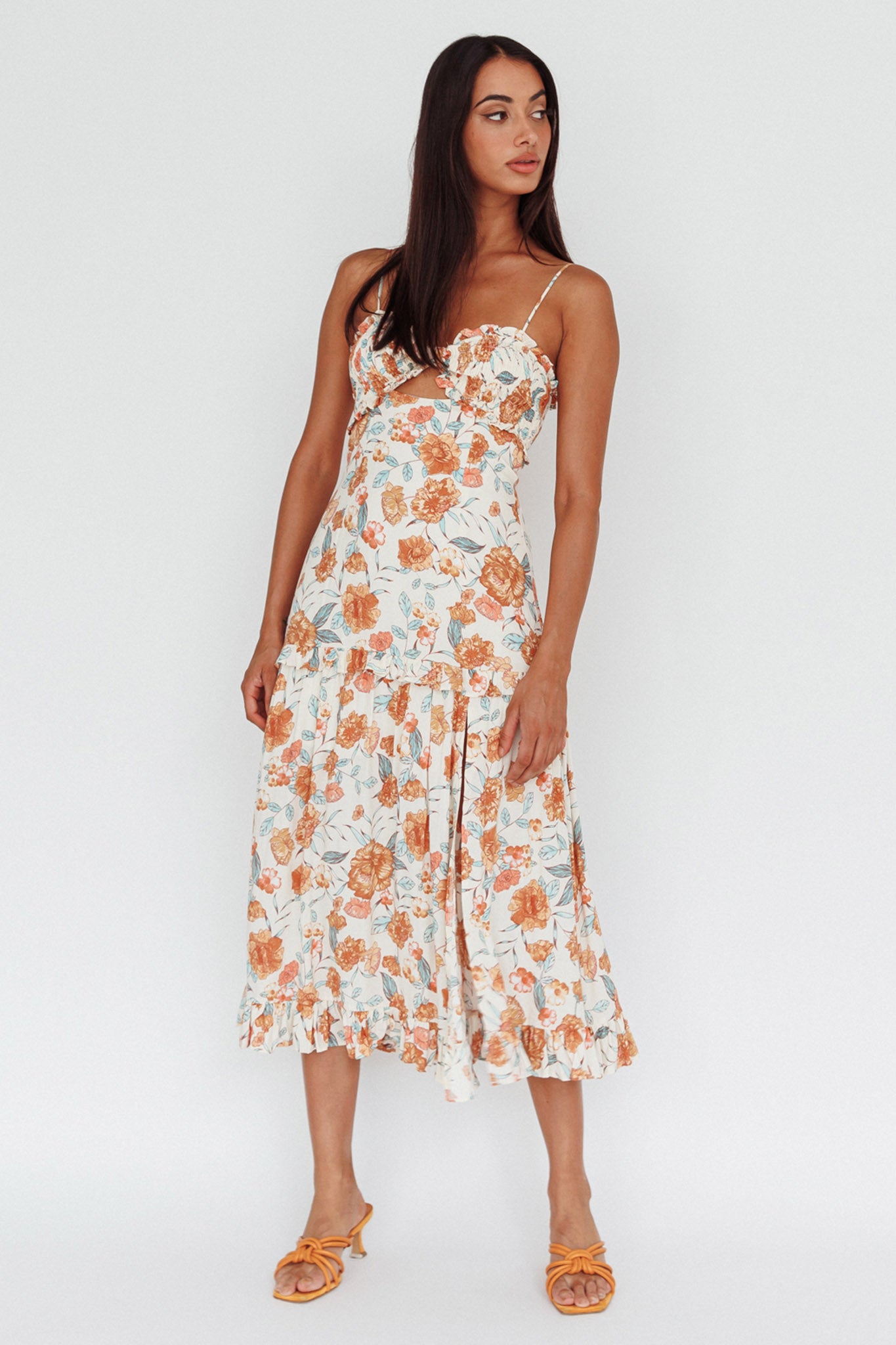 Make an entrance in our super cute Everglow midi dress. Featuring a shirred bust and frill trim detail. It's perfect for weekend brunch dates with your girls. Team it with tan slides and a woven tote for a chic look.