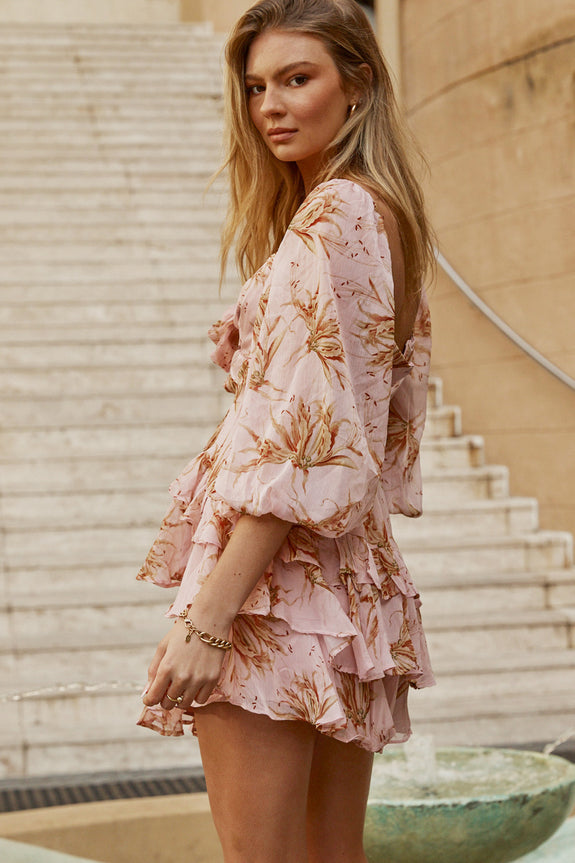 Flower Child Three Quarter Sleeve Bust Tie Ruffle Dress Lily Print Pink