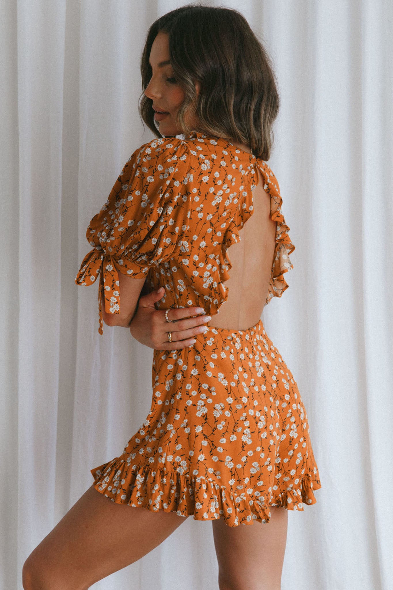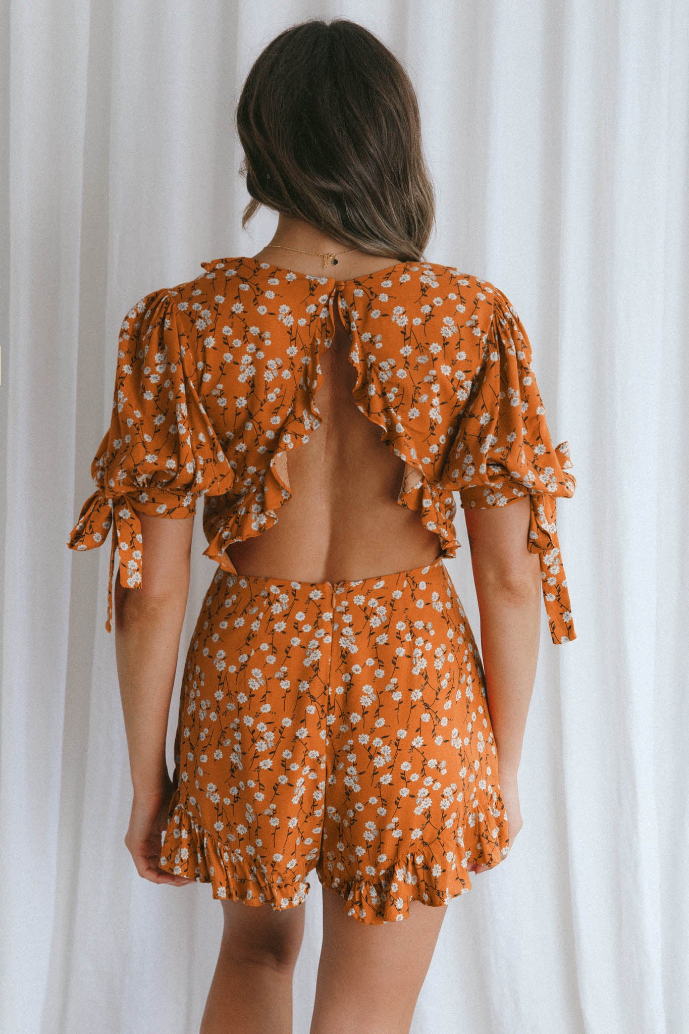 Francine Short Sleeve Tied Bust Romper Floral Orange