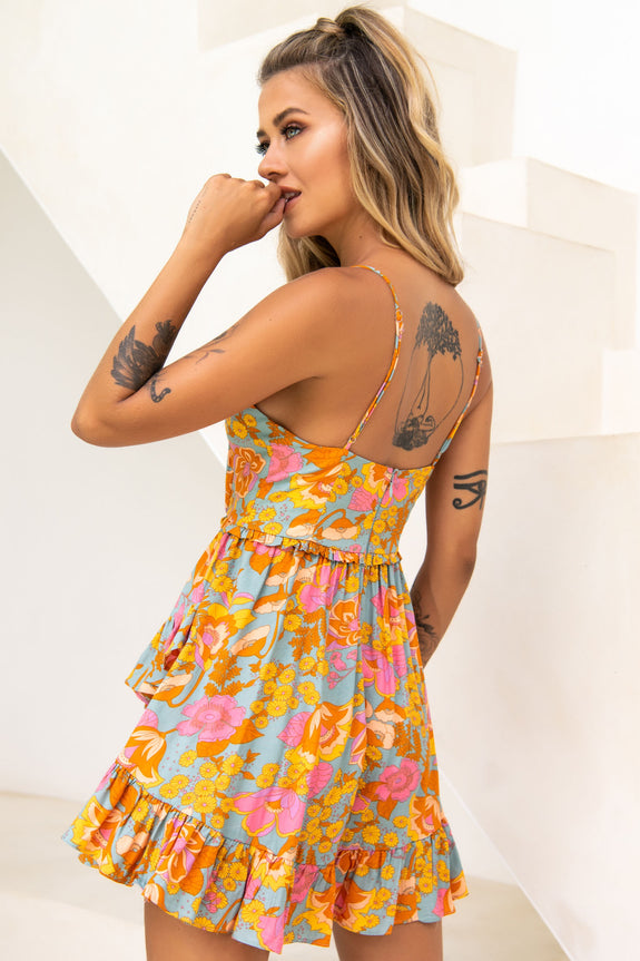 Geordie Ruched Bust Frill Trim Dress Floral Print Aqua Multi
