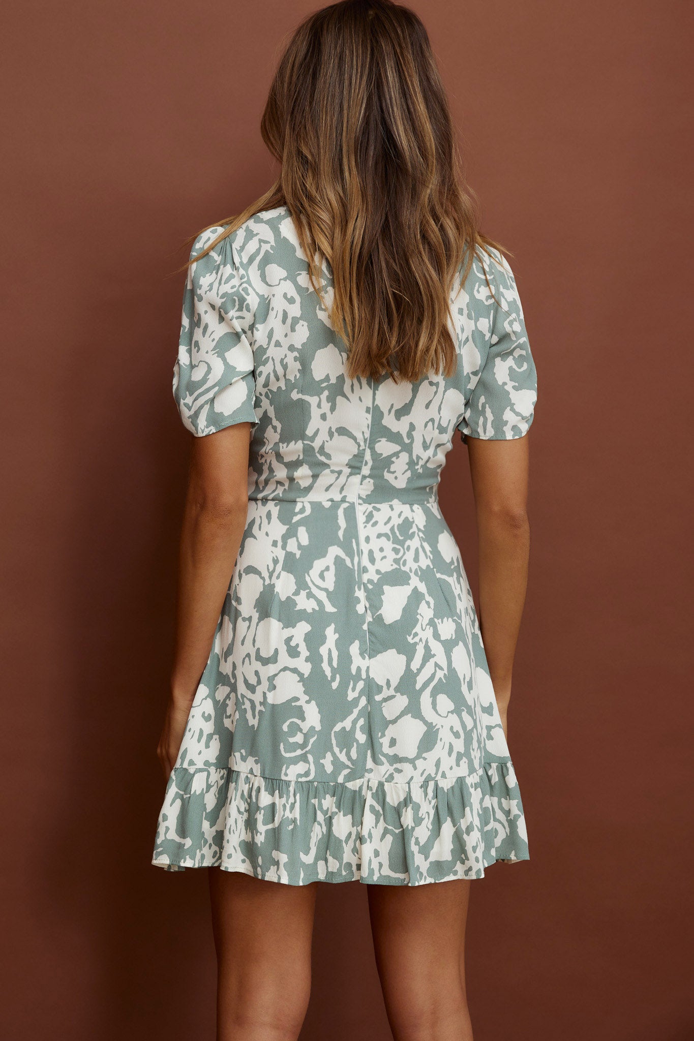 Georgina Ruched Sleeve Tea Dress Stencil Print Sage