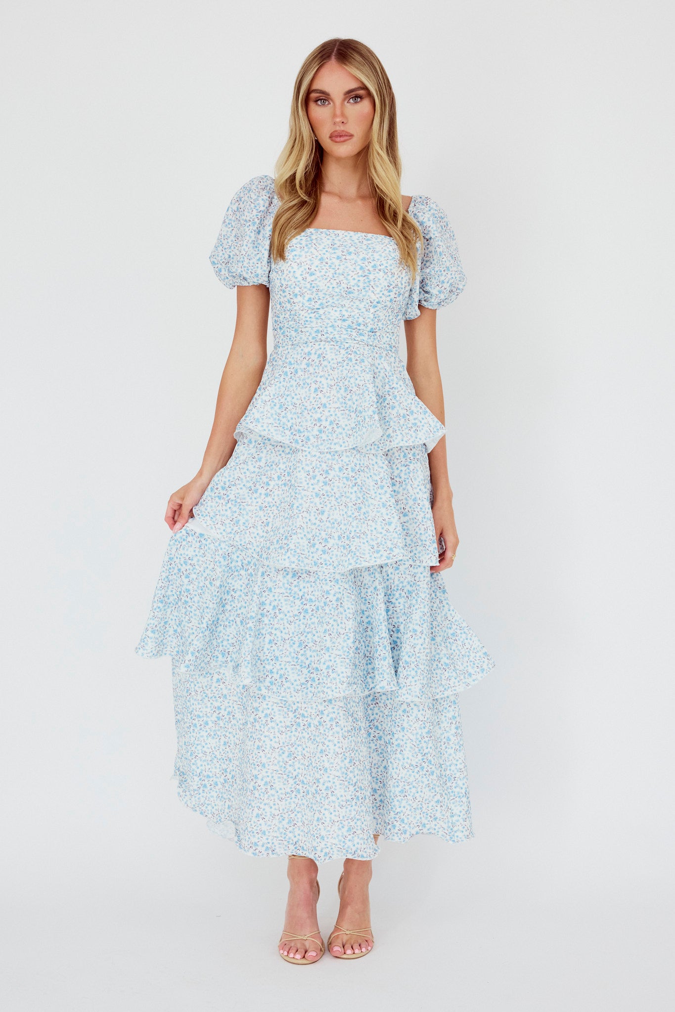 Giavana Puff Sleeve Layered Maxi Dress Floral Blue