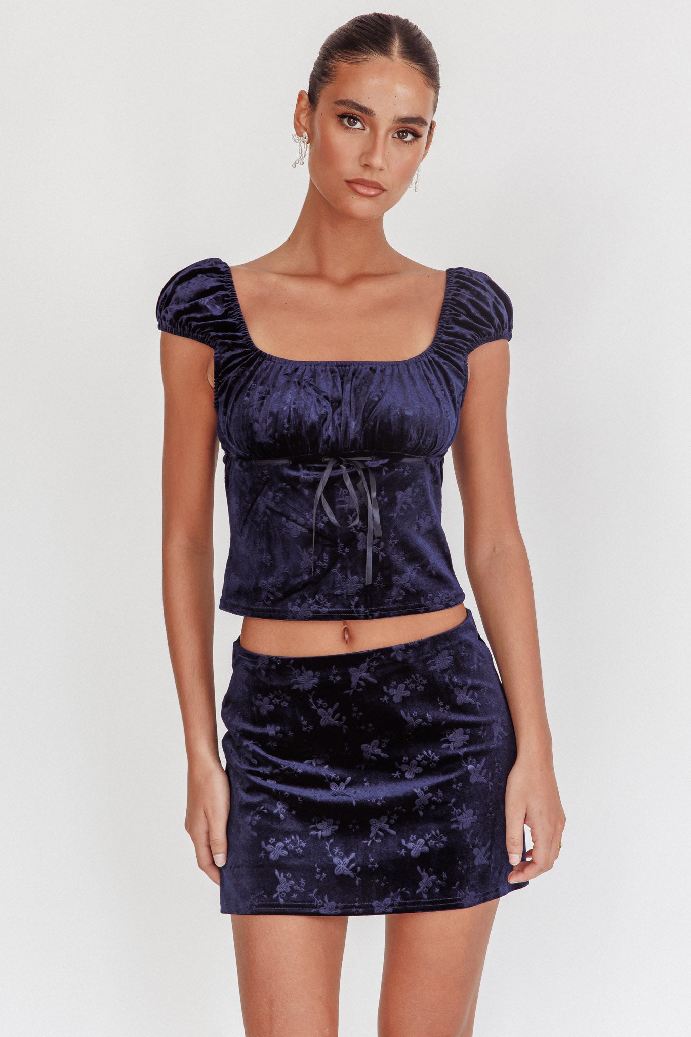 Make a statement in our pretty Good Luck top. Featuring a soft, velvet fabric and ribbon trim, it's perfect for a romantic date night with your lover. Team it with our High Rollers skirt and mules for a look that will turn heads.