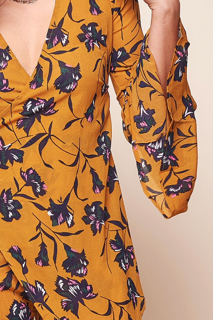 Grace Bell Sleeve Asymmetrical Wrap Booty Romper Mustard