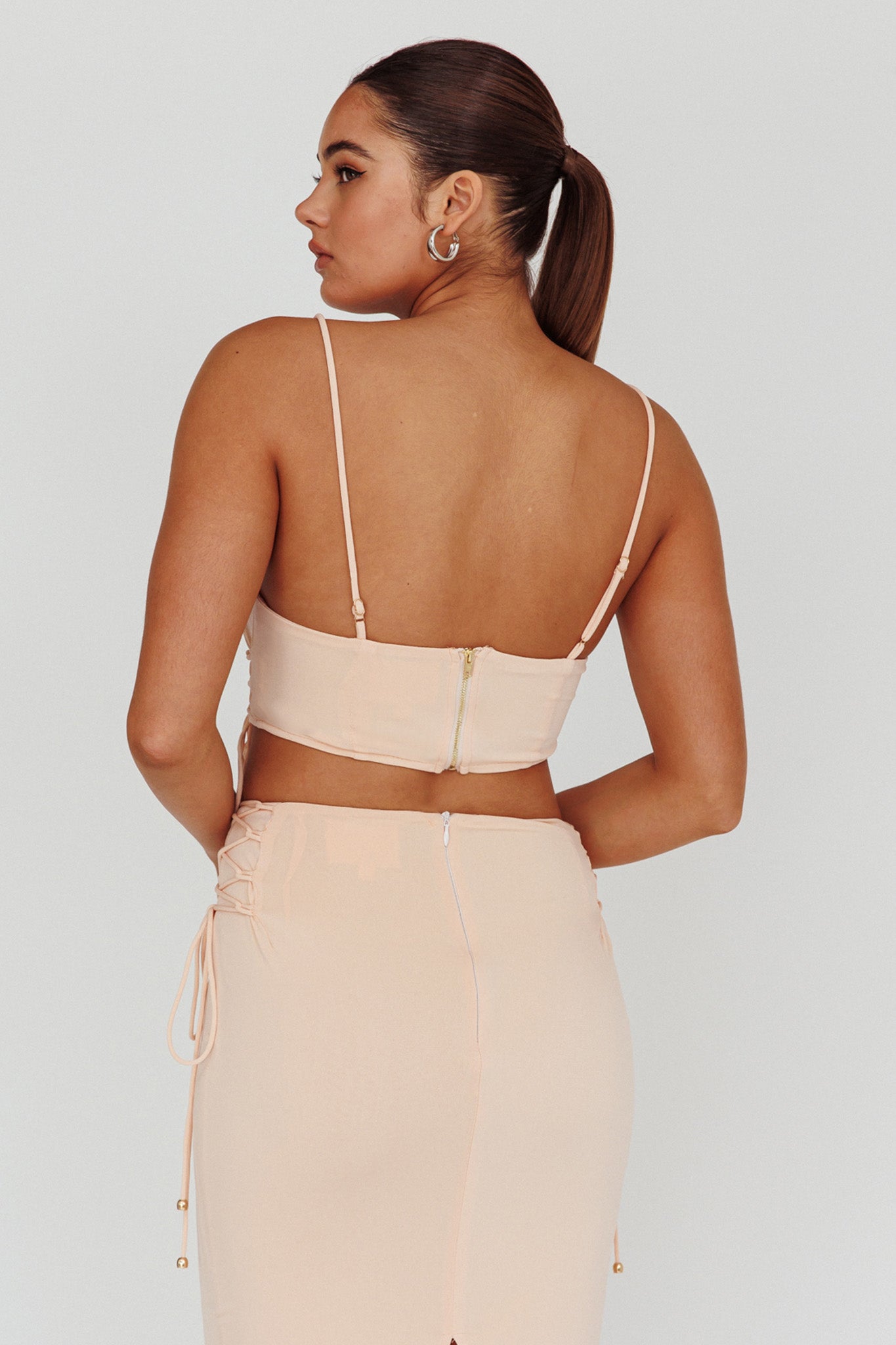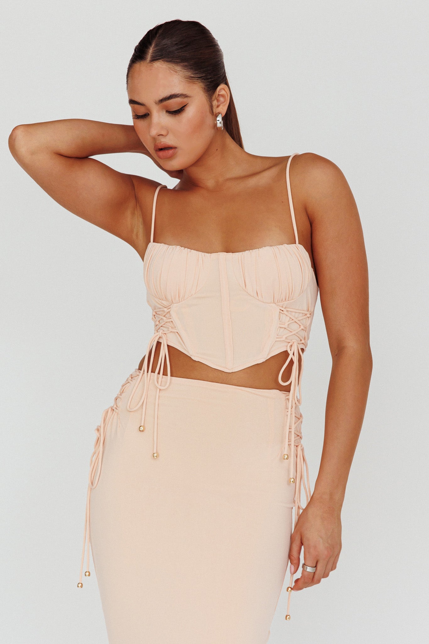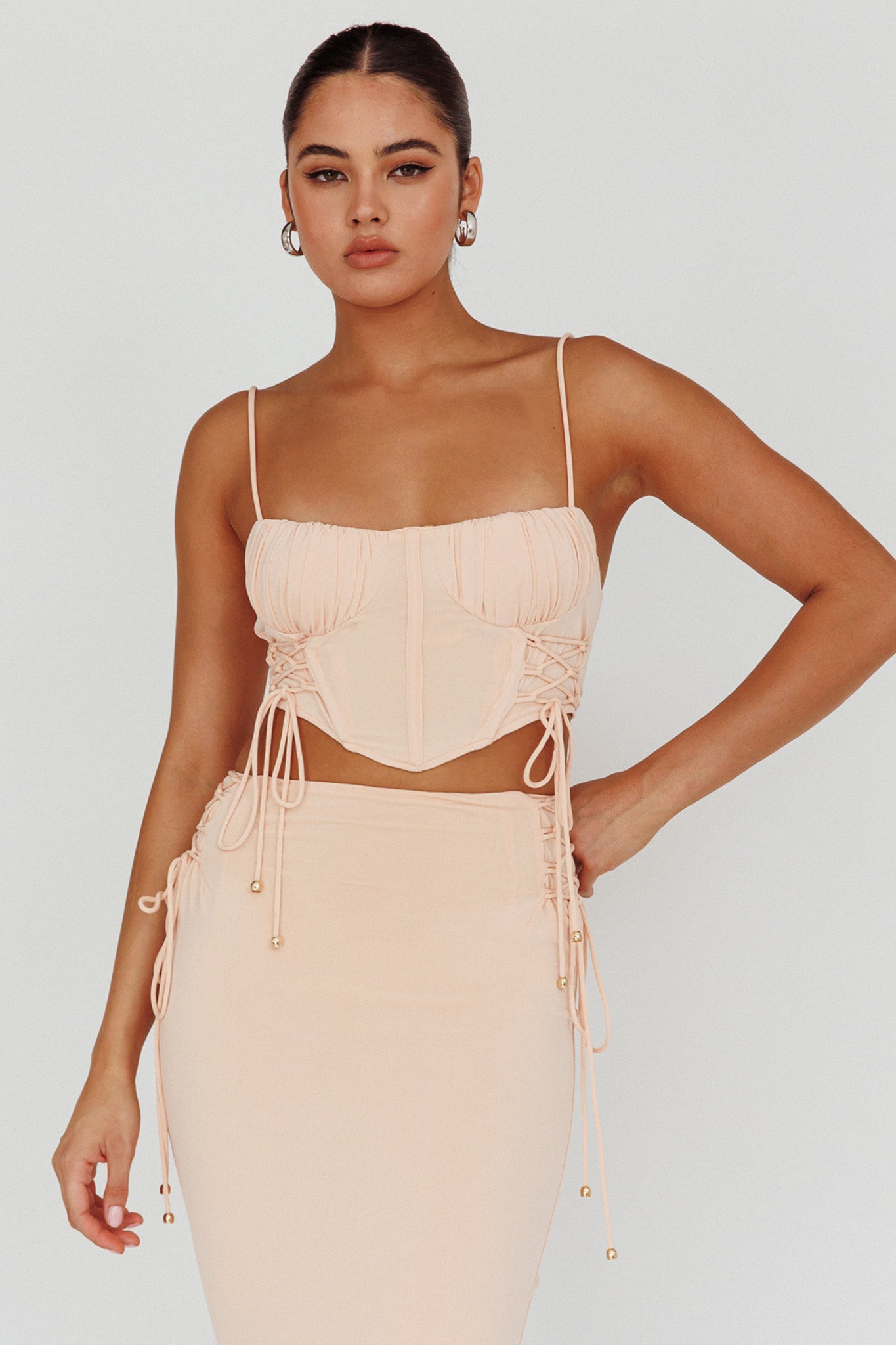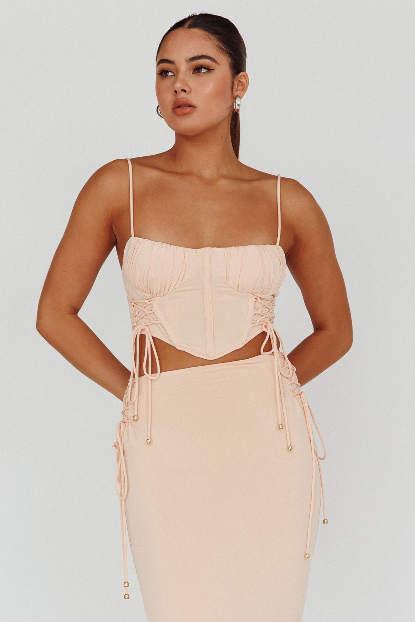 You will fall head over heels for our gorgeous Graziella top. Featuring boning in the bodice and lace-up detail in the sides, we're in love! Wear it to Sunday Brunch teamed with its matching midi skirt and mules.