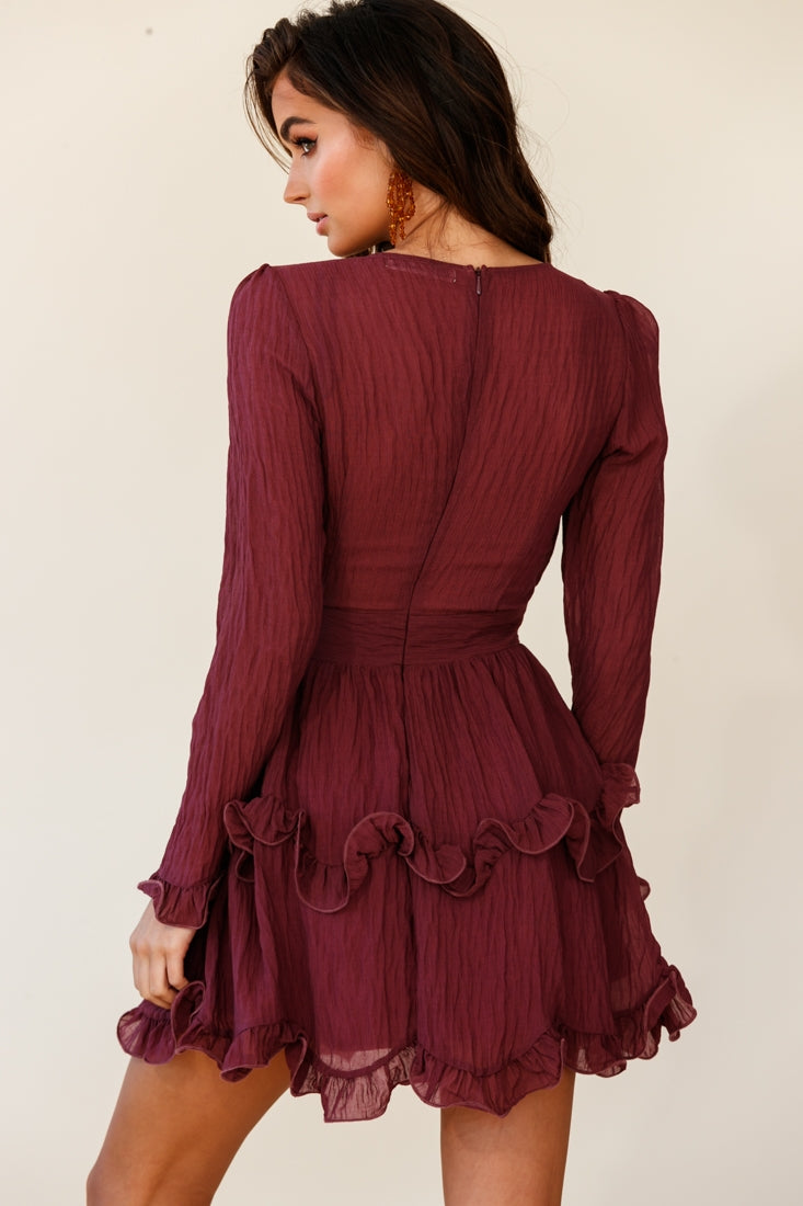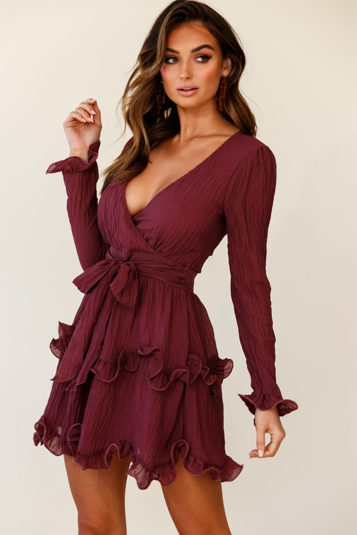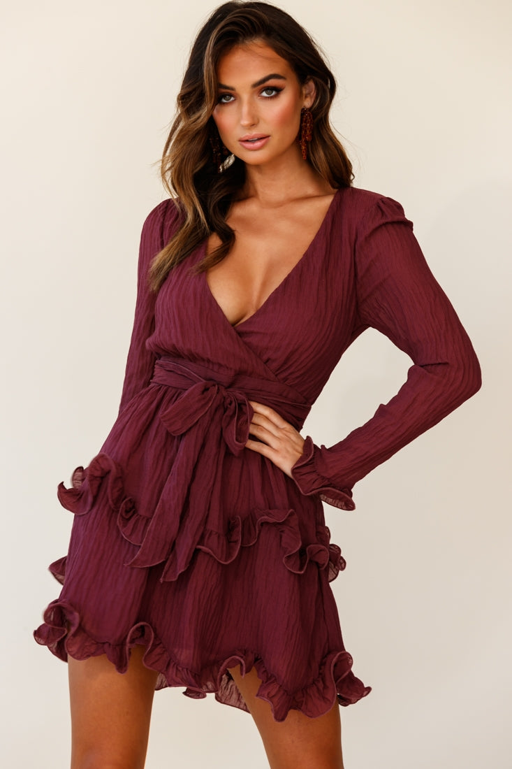 Make an entrance in our flirty and ultra feminine Greta dress. Featuring a V-neckline, long sleeves, flattering wrap front and tiered ruffles around the skirt. We love the soft chiffon fabric with unique crinkled texture. Team it with some strappy heels and gold hoops for a look we are loving.
