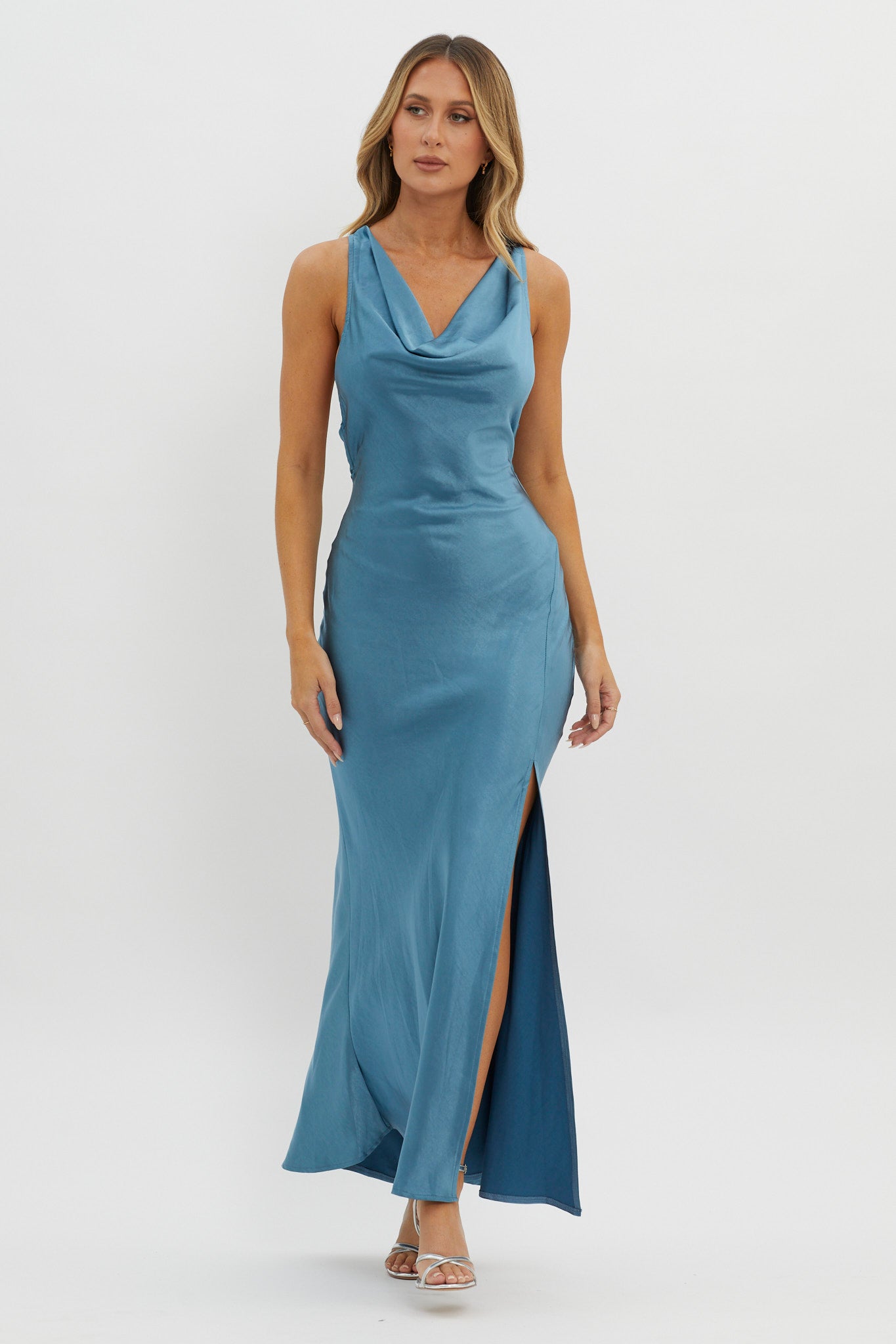 Make your grand entrance in our gorgeous Gwendelynn dress. Featuring floral applique detail in the back straps and a cowl neck. It's perfect for prom or a special event. Team it with nude heels and a satin clutch for a look we are head over heels for.