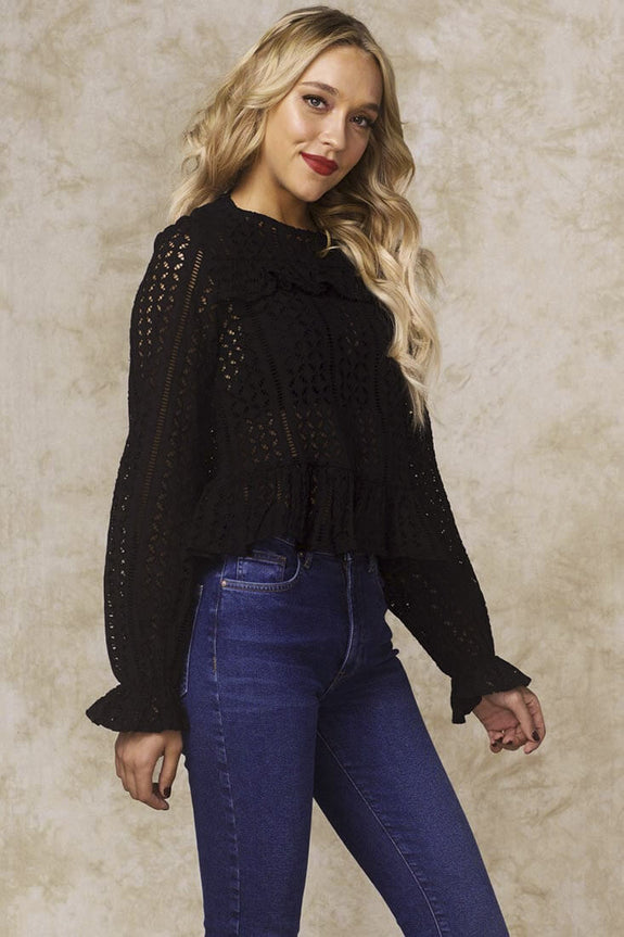 Crafty long sleeved mesh top with subtle keyhole back and ruffles around the wrists. Eclectic eyelet detail are a fun touch. Pair with a black vegan leather mini skirt and thick heeled boots.