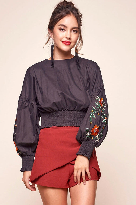 Cancun awaits! This crop top keeps an exotic flair with bold colored flowers along the sleeves. Pair with high waisted shorts, a bold lip, and round sunnies.