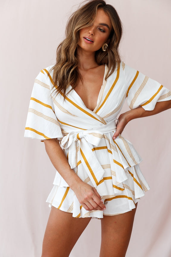 Happiness shouldn't be limited to an hour. You'll be smiling all day long in our Happy Hour Romper. Perfect for after work drinks with your girls, catching up on the latest goss or a flirty first date. Featuring a flouncy, layered shorts design, breezy angel sleeves, deep V-neckline, open, V-back and a waist tie to finish the look. Team it with nude heels and gold hoop earrings for playful look we can't get enough of.