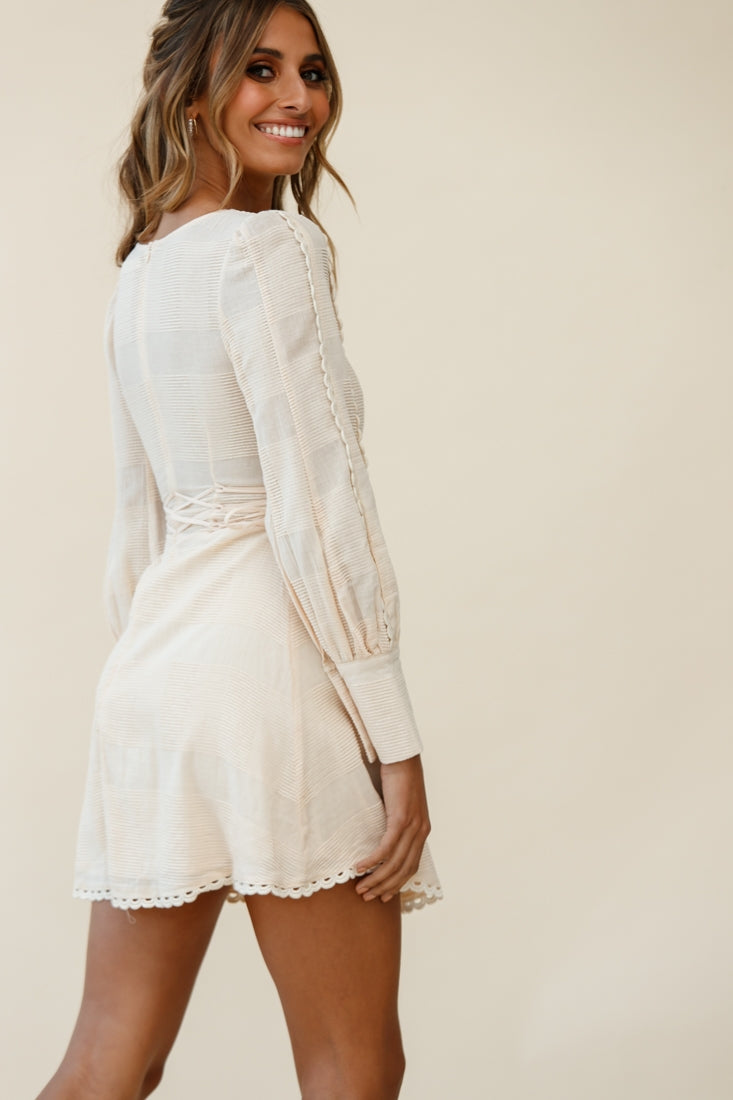 You're the picture of elegance in our pretty Harley dress. Featuring cuffed, long sleeves with the prettiest scalloped-lace embroidery trim, super cute corset detail around the waist that ties at the sides and the same scalloped lace trim repeated around the hem. Perfect for high tea with your besties teamed with classic nude pumps and a tote.
