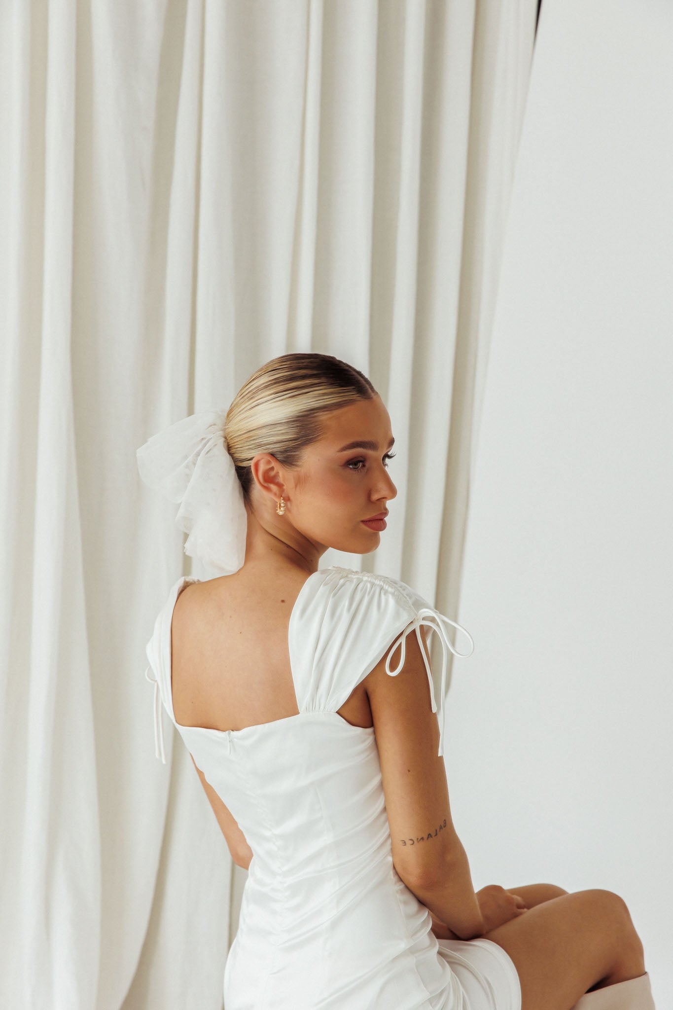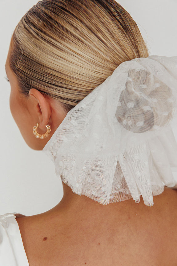 Elevate your look with our pretty Hoda scrunchie. Featuring a pretty, lace fabric and stretchy elastic. Wear it for your bridal shower or on your big day!