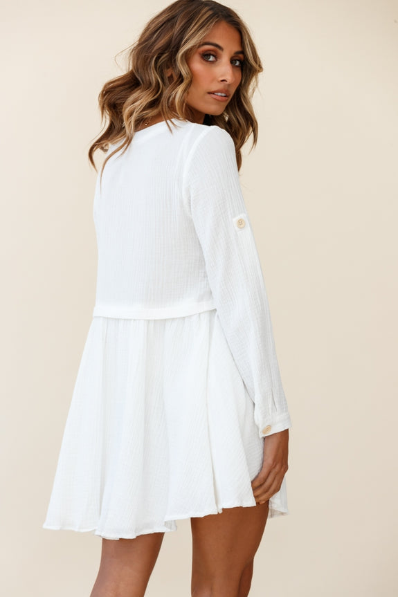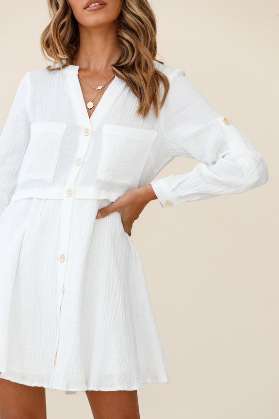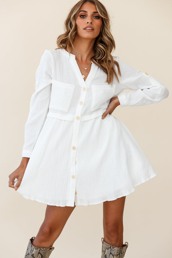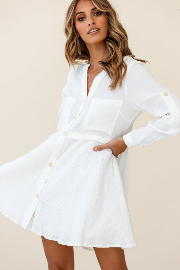 Hey there cutie! Where'd you get that dress?! We are in love with our super chic Holly shirt dress. Featuring long sleeves, a textured crepe fabric throughout, wooden button placket and two chest pockets. Perfect for a crisp day strolling the farmers markets teamed with a hat, tights and riding boots. Cute!