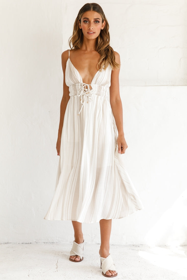 Turn heads in our breezy Hosanna dress. Partially lined to the knees it features a triple drawstring under the bust, adjustable shoulder straps, pockets and on-trend midi length. Perfect for a day by the beach or strolling the vintage flea markets. Team it with some straw wedges and a tote for a chic Summer look we are loving.