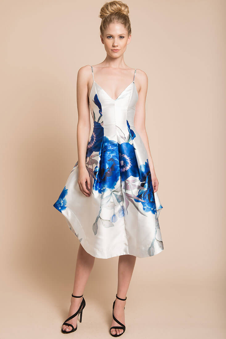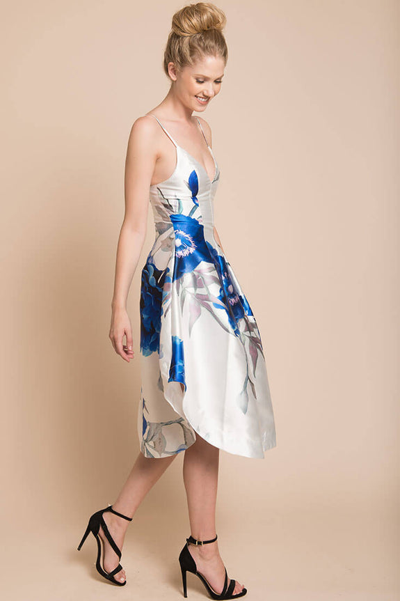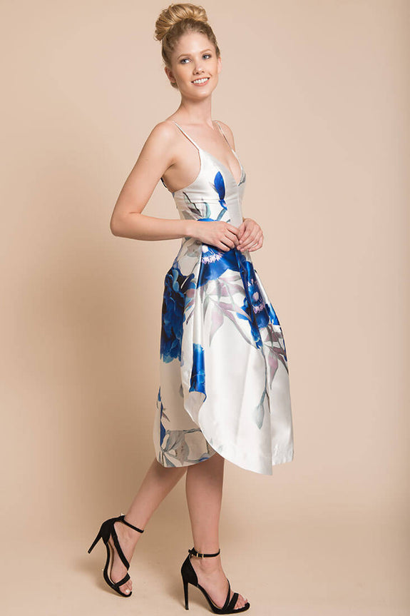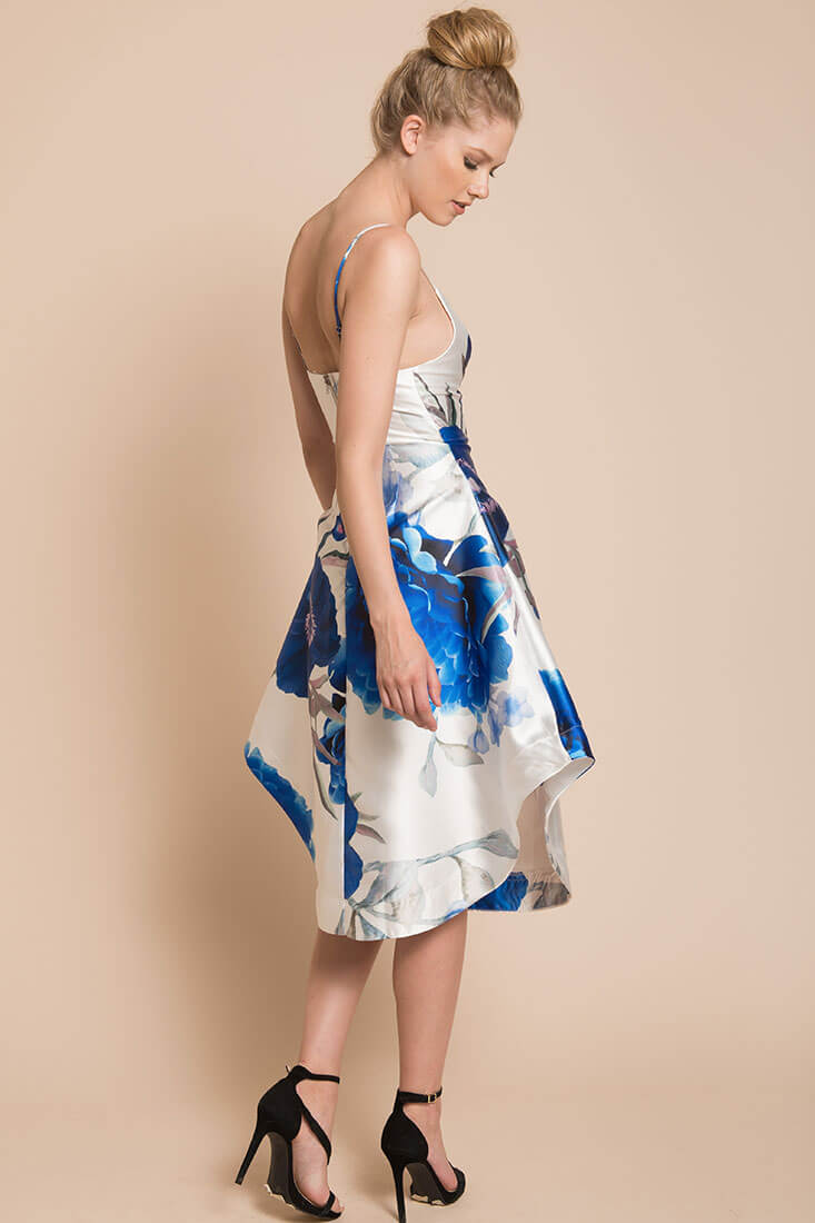 Flowers dance on this shiny asymmetrical dress. These vibrant florals will make you the belle of the ball, guaranteed! Wear with silver strappy heels.
