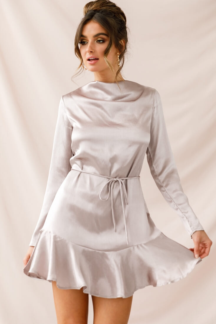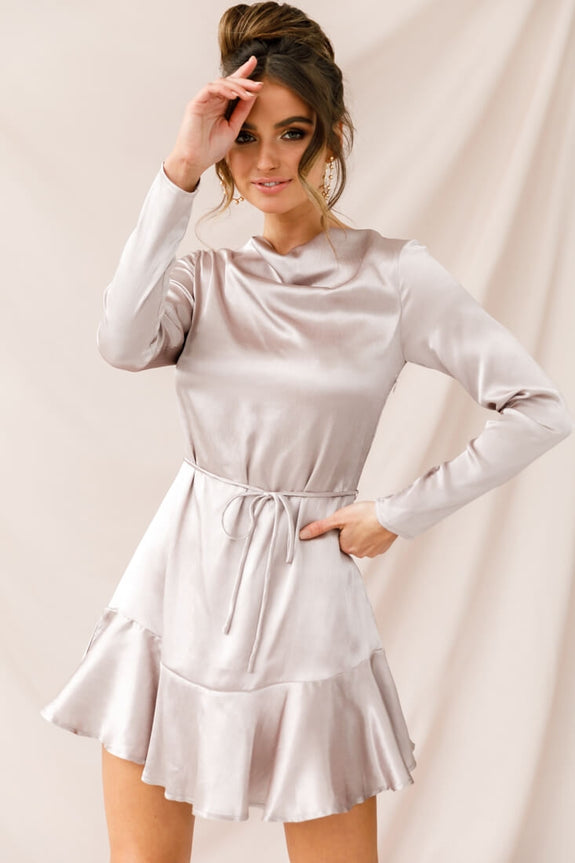 Channel your inner Jane Jetson in our sleek, Interstellar dress. Featuring a super chic and simple cut with long sleeves, a string-tie waist, high cowl neck and ruffle hemline to balance out the clean lines. We are loving its silky fabric and would love to see this teamed with black suede thigh-high boots to add a contrasting texture or keep it sleek and team it with a barely-there nude heel.