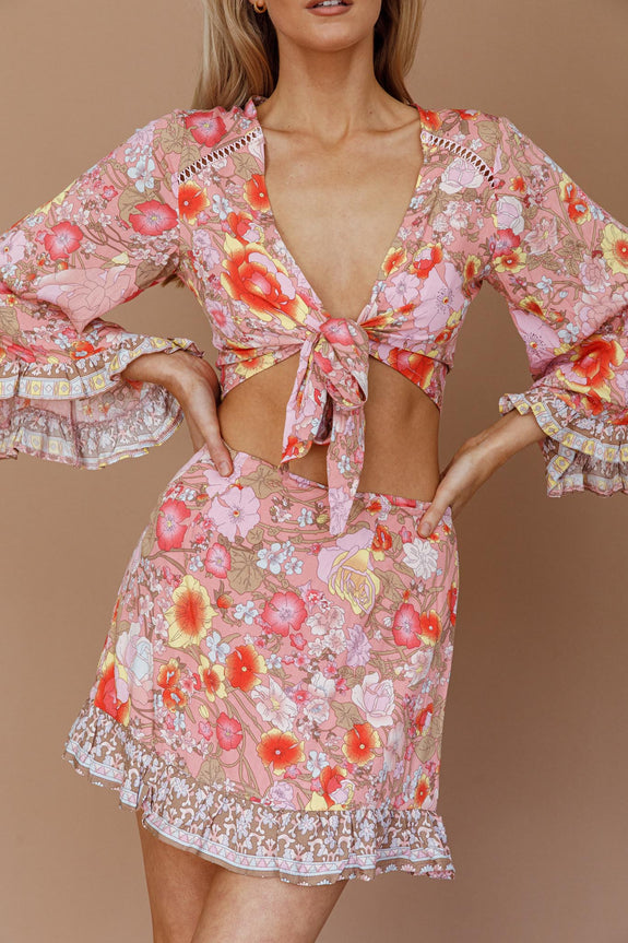 Breeze through your Summer in our pretty Island Girl crop top. Featuring a tied bust and cute frill trim detail. Perfect for weekend pool parties teamed with its matching skirt and wedges.