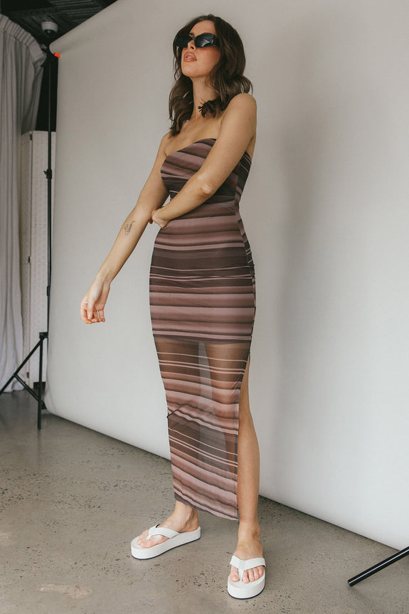 You will look super chic in our gorgeous Island Life maxi dress. Featuring a strapless style and mesh overlay. Perfect for weekend brunch with your besties teamed with retro sunglasses and a tote.