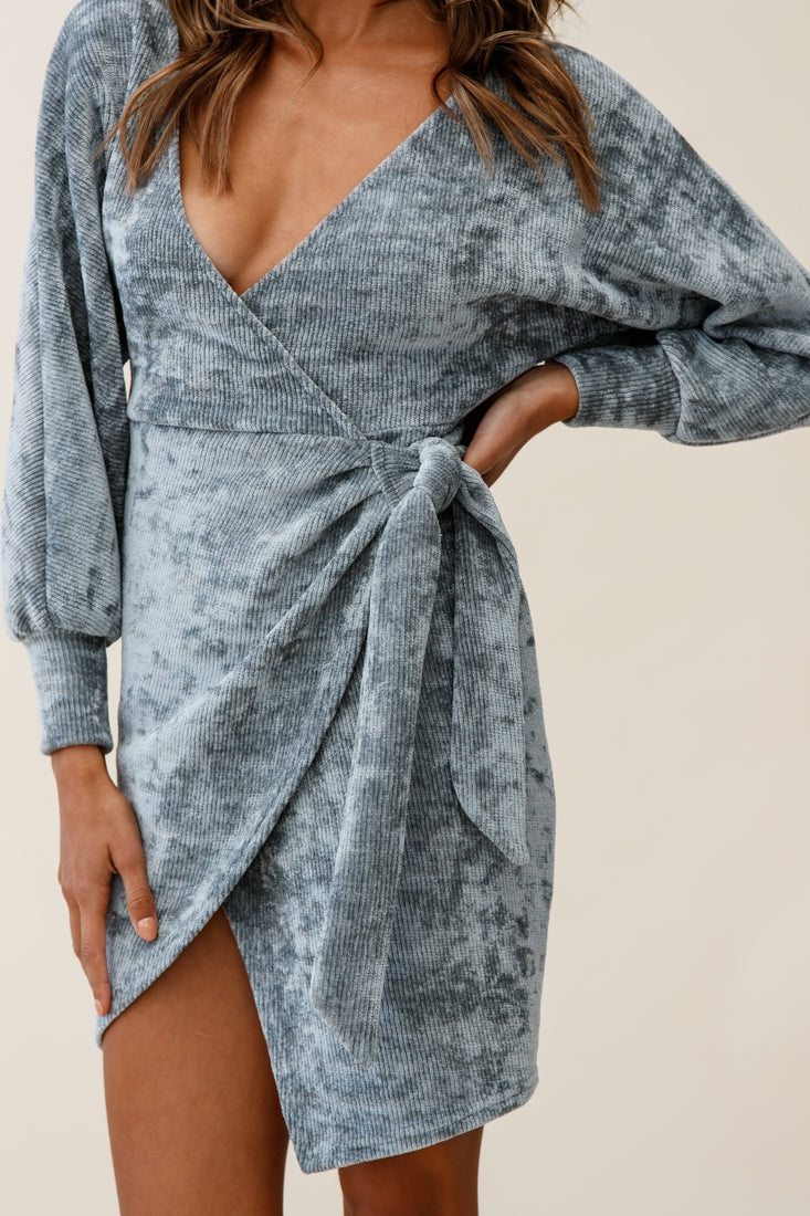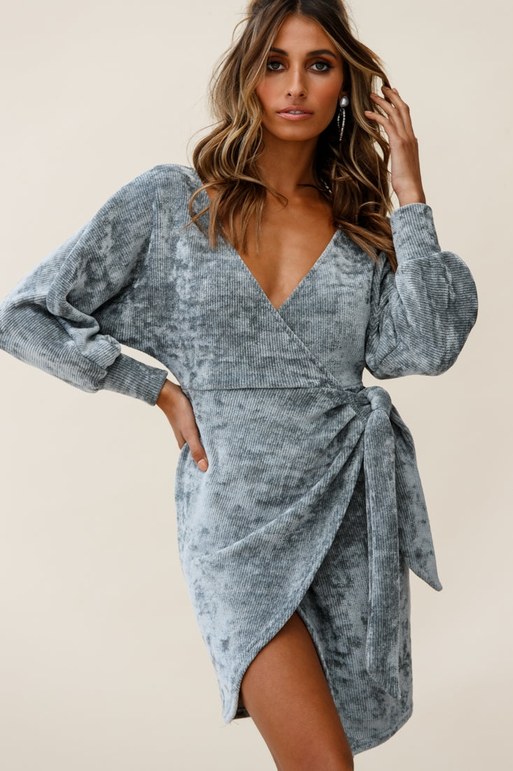 Isolde Ribbed Velour Wrap Dress Grey