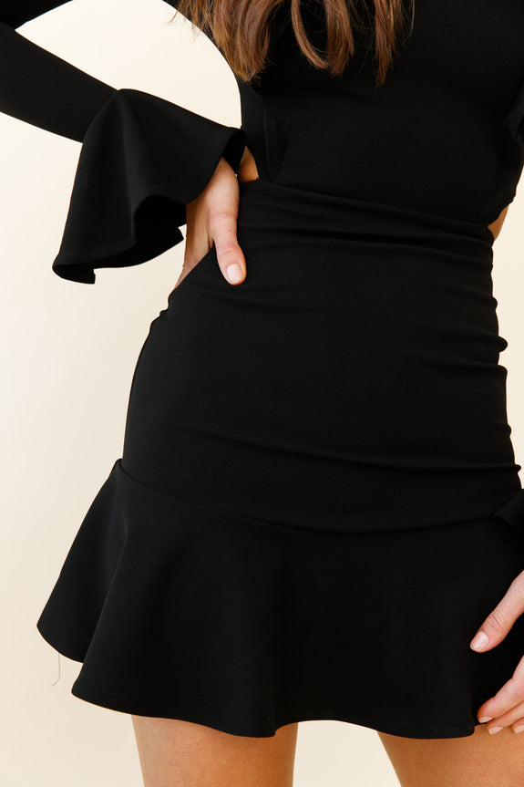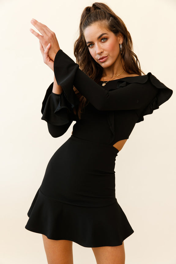 Okay girl, we see you! Own every room you walk into in our Jackie dress. The ruffles in the bodice are balanced perfectly by the flounce hem and ruffle cuffs. We are loving the little peek-a-boo cutouts at the waist that continue around to the back to give a two-piece illusion. Team it with a smoky eye and clear heels and we can guarantee they won't be forgetting you too easily. Icon!