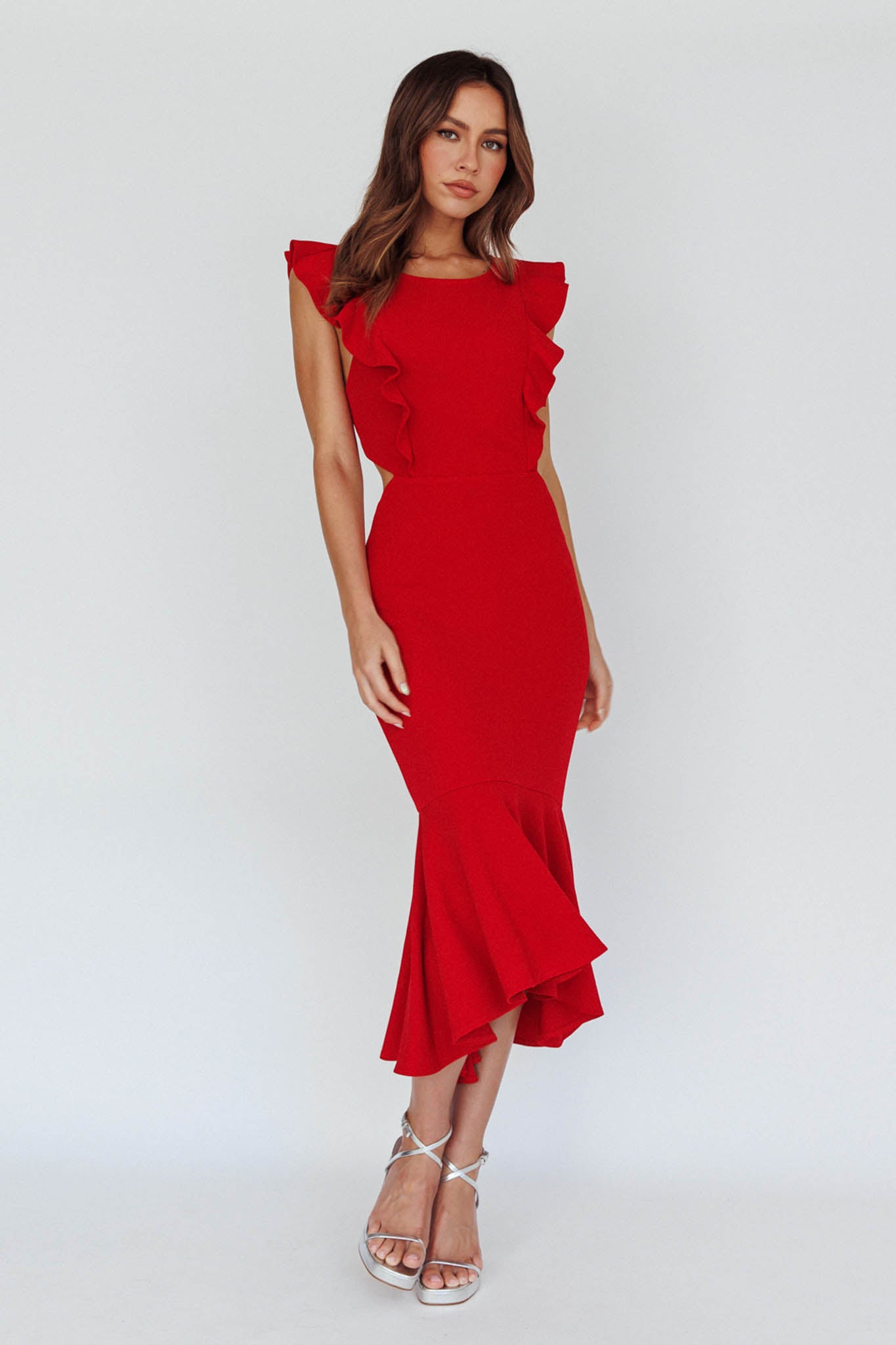 Okay girl, we see you! Own every room you walk into in our Jackie dress. Classy, sassy and a little bad-assy, this structured, pinafore style mid-length dress is balanced perfectly by the wide ruffle, high-low hem and ruffle straps. In addition to hugging you in all the right places, we are loving the little peek-a-boo cutouts at the waist that continue around to the back to give a two-piece illusion. Team it with chunky gold jewelry and a bold lip and we can guarantee they won't be forgetting you too easily. Icon!