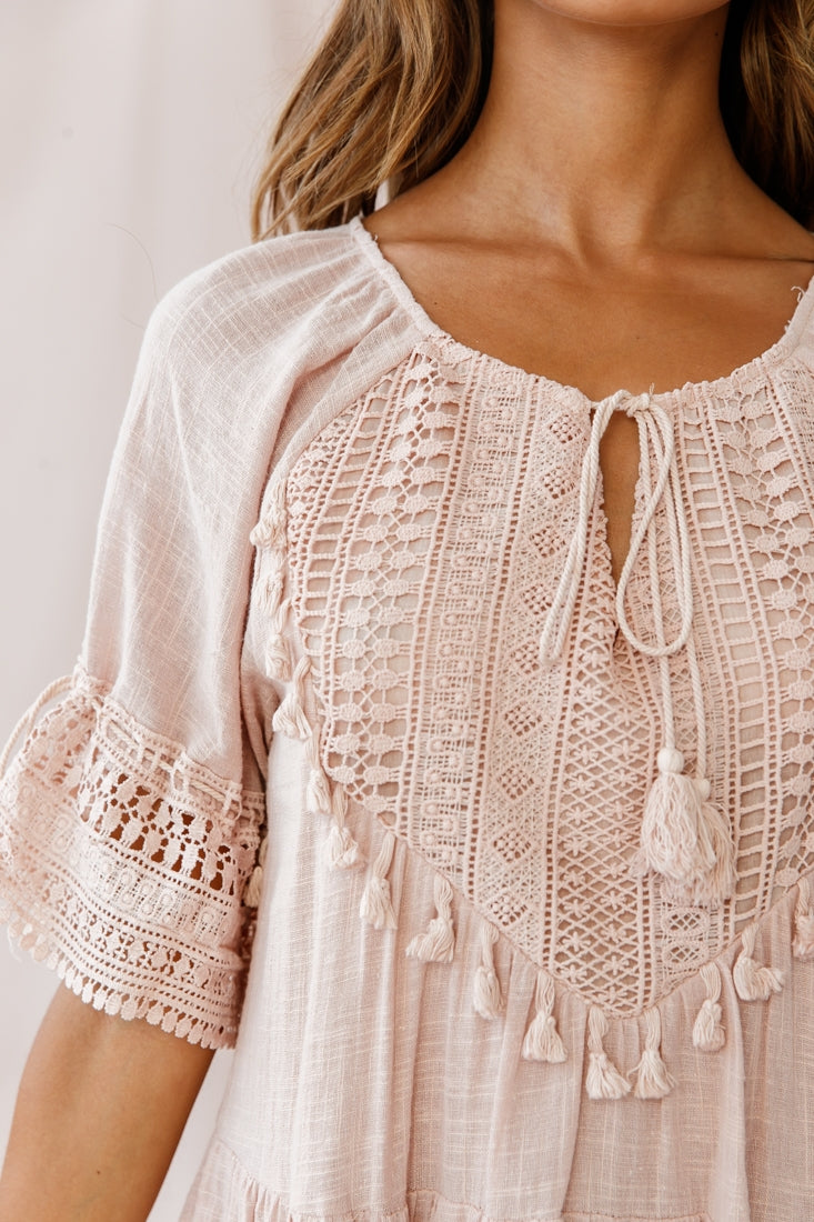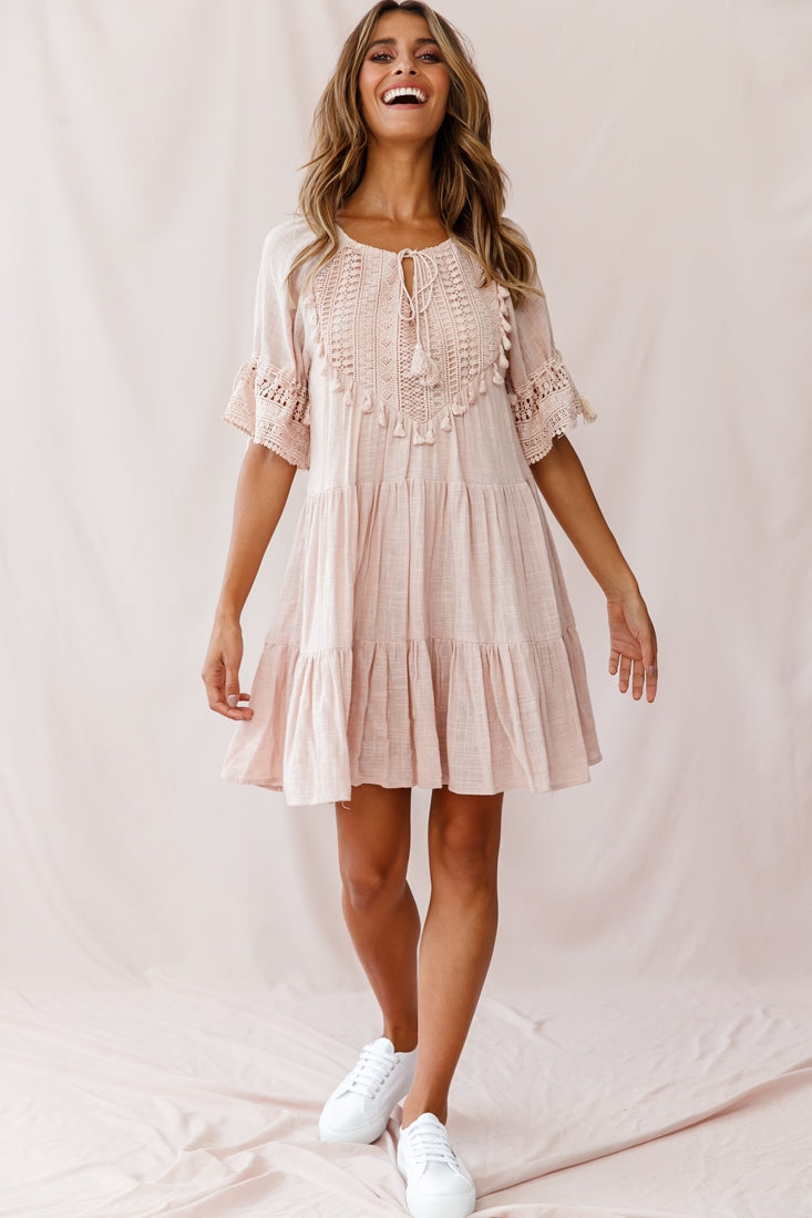 Jada Crochet and Tassel Kaftan Dress Beige