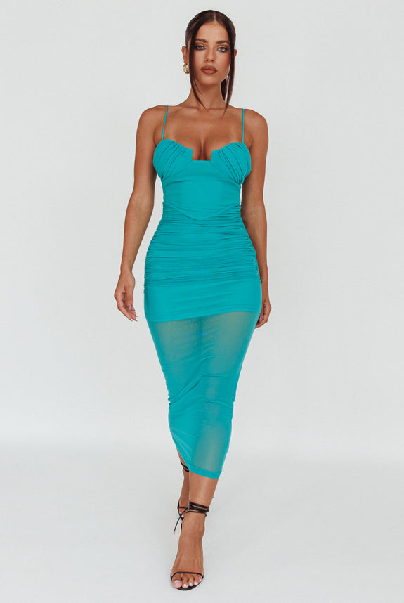 Turn heads in our hot Jahzel midi dress. Featuring a mesh overlay and ruching detail. It's perfect for a girls' night out teamed with mules, a tote and a sleek ponytail for a look we are loving.