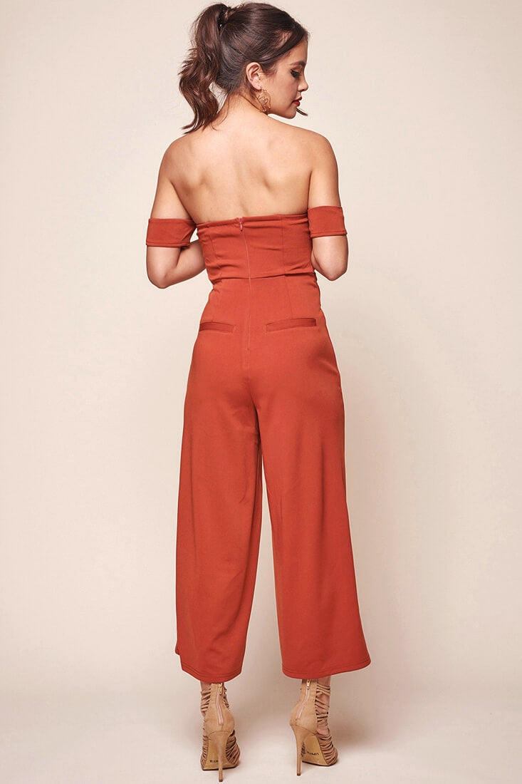 A sporty jumpsuit destined to make you a star! Off the shoulder and waist tie design make every dream a reality. Try sporting with golden earrings and strappy heels.